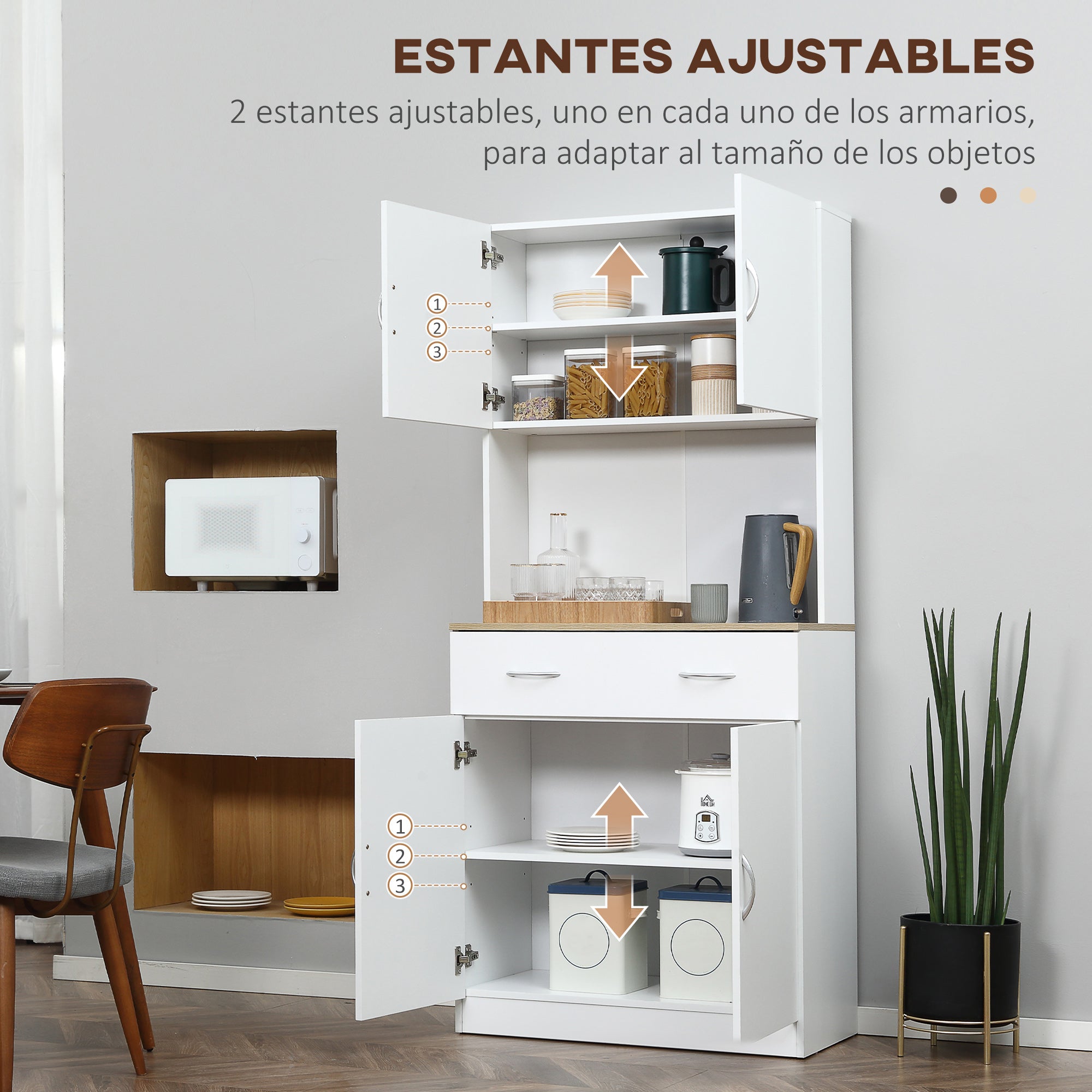 - - TÁGAS TÁROLÓHELY: Ez a konyhai kamra bőséges tárolóhelyet kínál. 1 fiókból és 2 ajtós szekrényből áll, mindegyikben állítható belső polccal, hogy megfeleljen különböző tárolási igényeidnek és a tárgyaid méretéhez igazíthass.