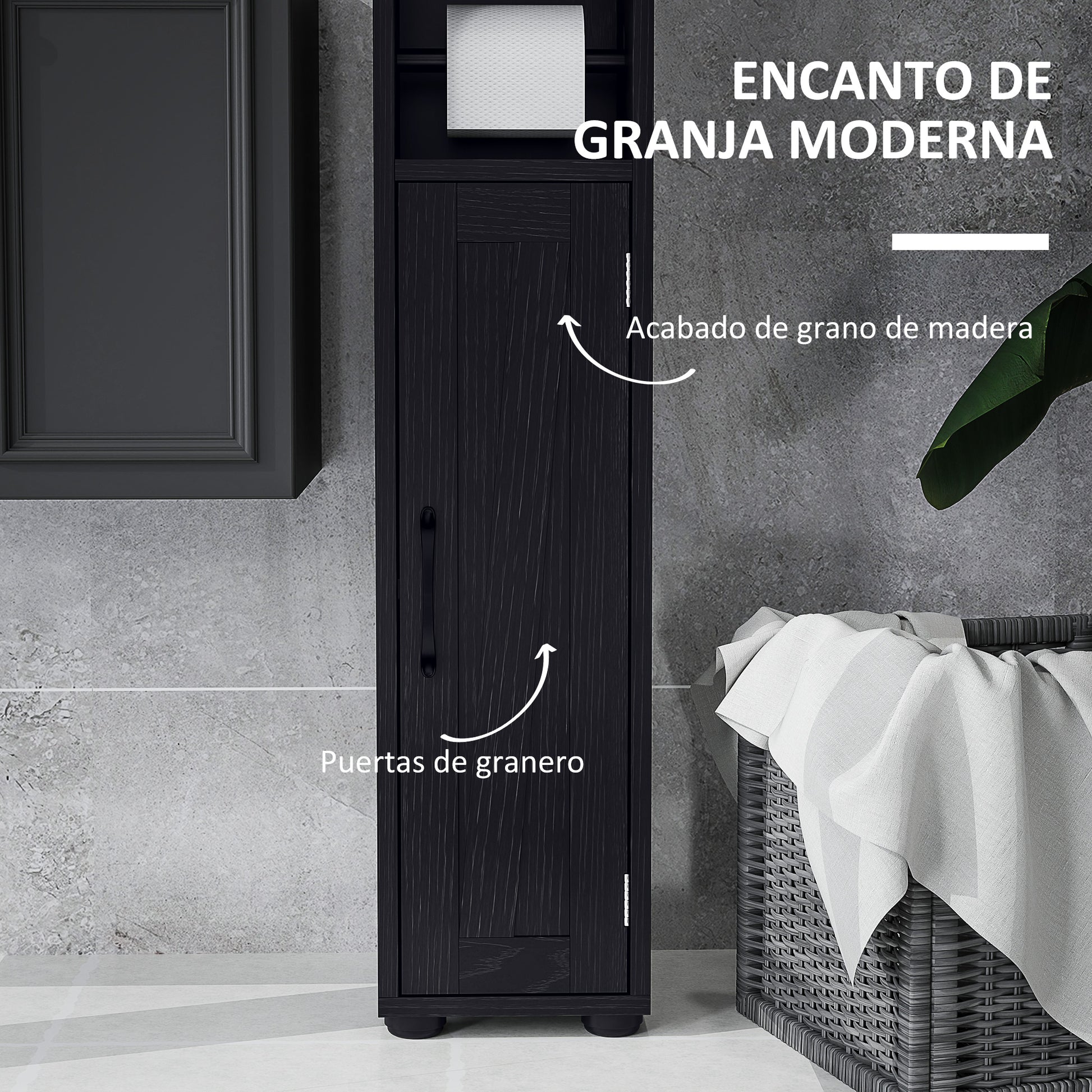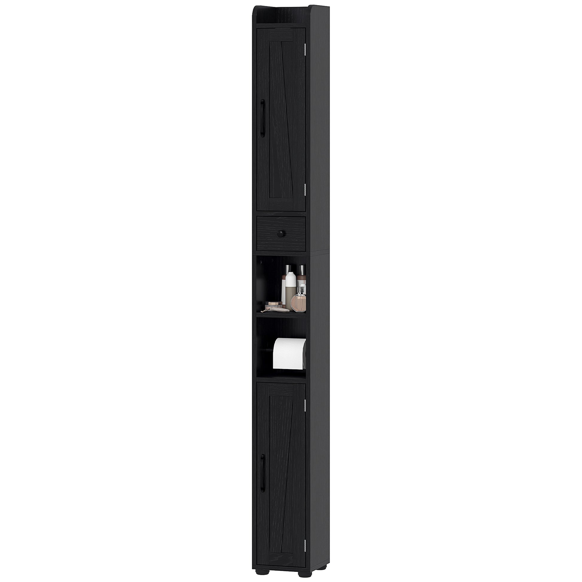 HOMCOM Szűk Fürdőszoba Oszlop 2 Ajtóval Magas Rusztikus Fürdőszobai Szekrény Fiókkal, Nyitott Rekesszel, Állítható Polcokkal és WC Papír Tartóval 20x20x185 cm Fekete
