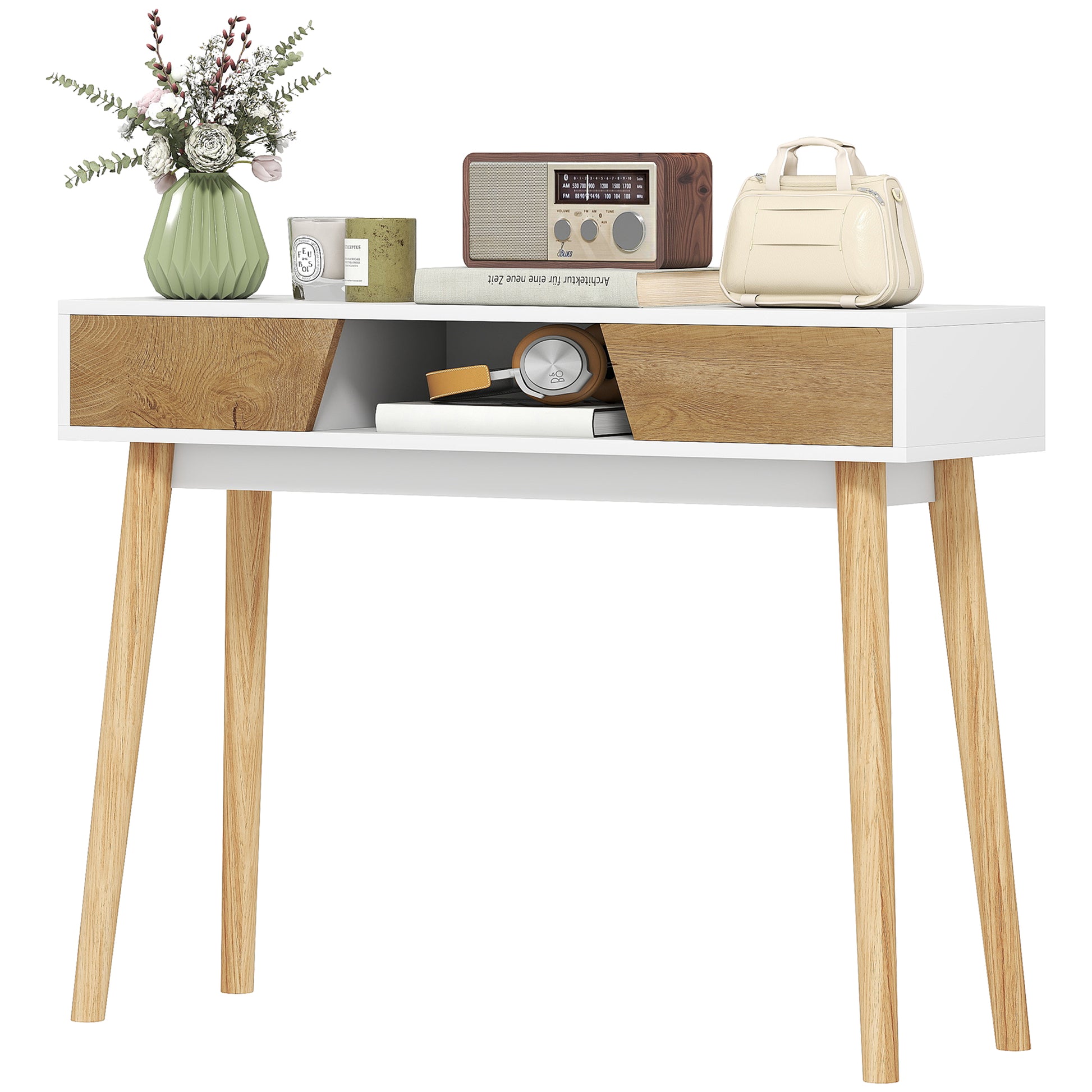 HOMCOM Schmall Konsolentisch Entryway Konsol Modern Sofa Tisch mat 2 Schublade, Offene Compartment an Holze Beem fir Flur, Entryway, Wunnzëmmer, Schlofzëmmer Wäiss