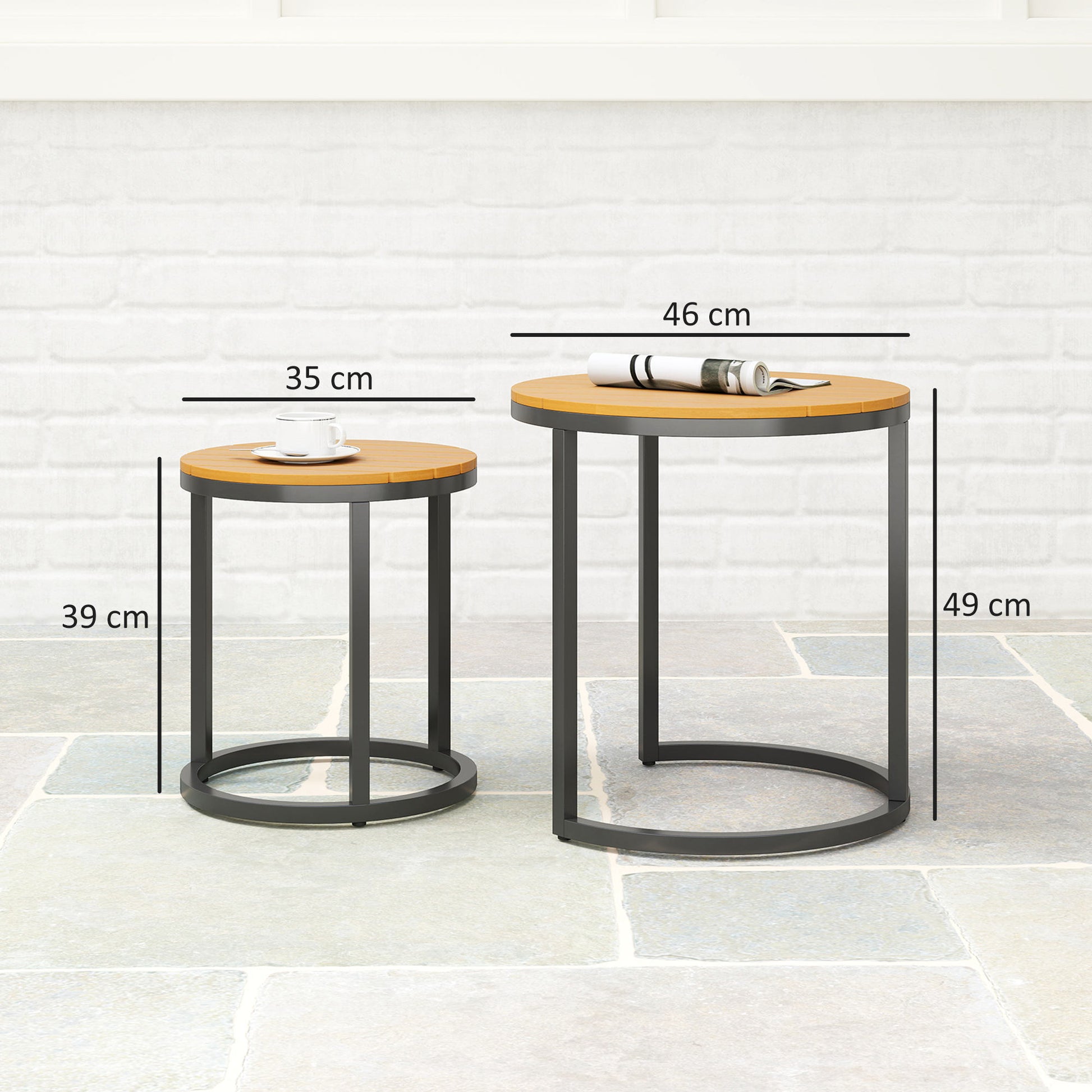- - ALLGEMENG DIMENSIONEN: De gréissten Tafel misst Ø46x49 cm (DxH) an de klenge Tafel misst Ø35x39 cm (DxH). Maximal Gewiichtskapazitéit: 50 kg (grousse Tafel), 30 kg (kleine Tafel). Keen Zesummenbau erfuerderlech