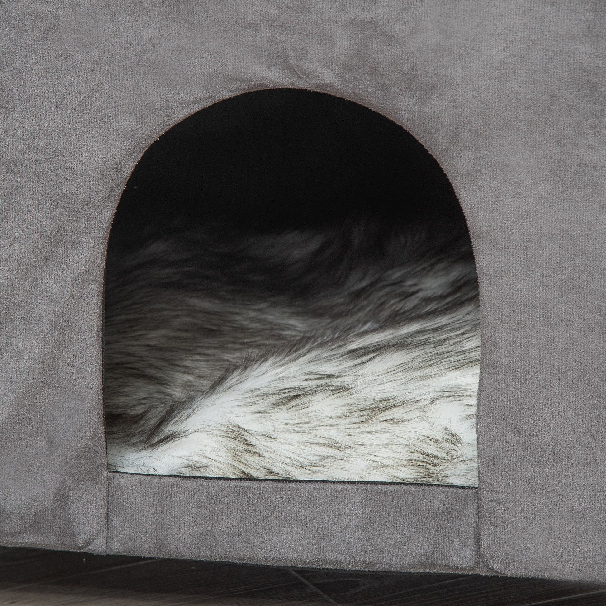 PawHut 2-zu-1 Kazehöhlen-Ottoman mat abnehmbarem Deckel, Entrée-Loch, wäscheschong Këssen an erhéichtem Holzbeinen fir den Indoor Gebrauch 60x45x44.5 cm Grouss