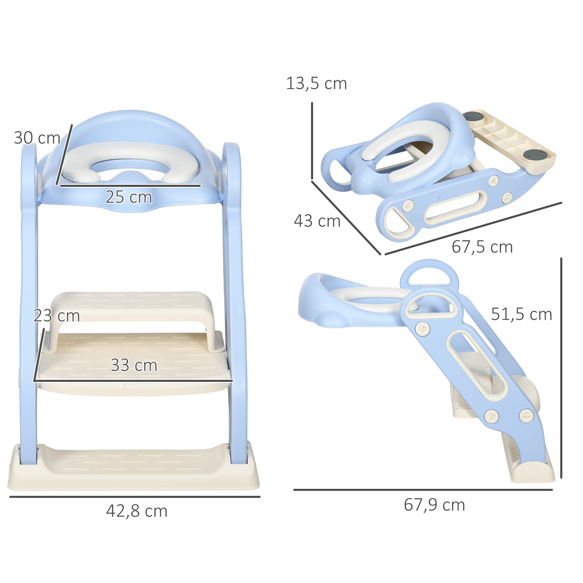 - - Vieläiteg Kompatibilitéit: Dëse Trainingseat ass gëeegent fir verschidde Toiletteformen, dorënner V-fërmeg, U-fërmeg, O-fërmeg Toiletten. Maximal Toilettehéicht: 60 cm. Gesamtmembere: 67.9L x 42.8W x 51.5H cm. Gëeegent fir Kanner vun 2 bis 6 Joer.