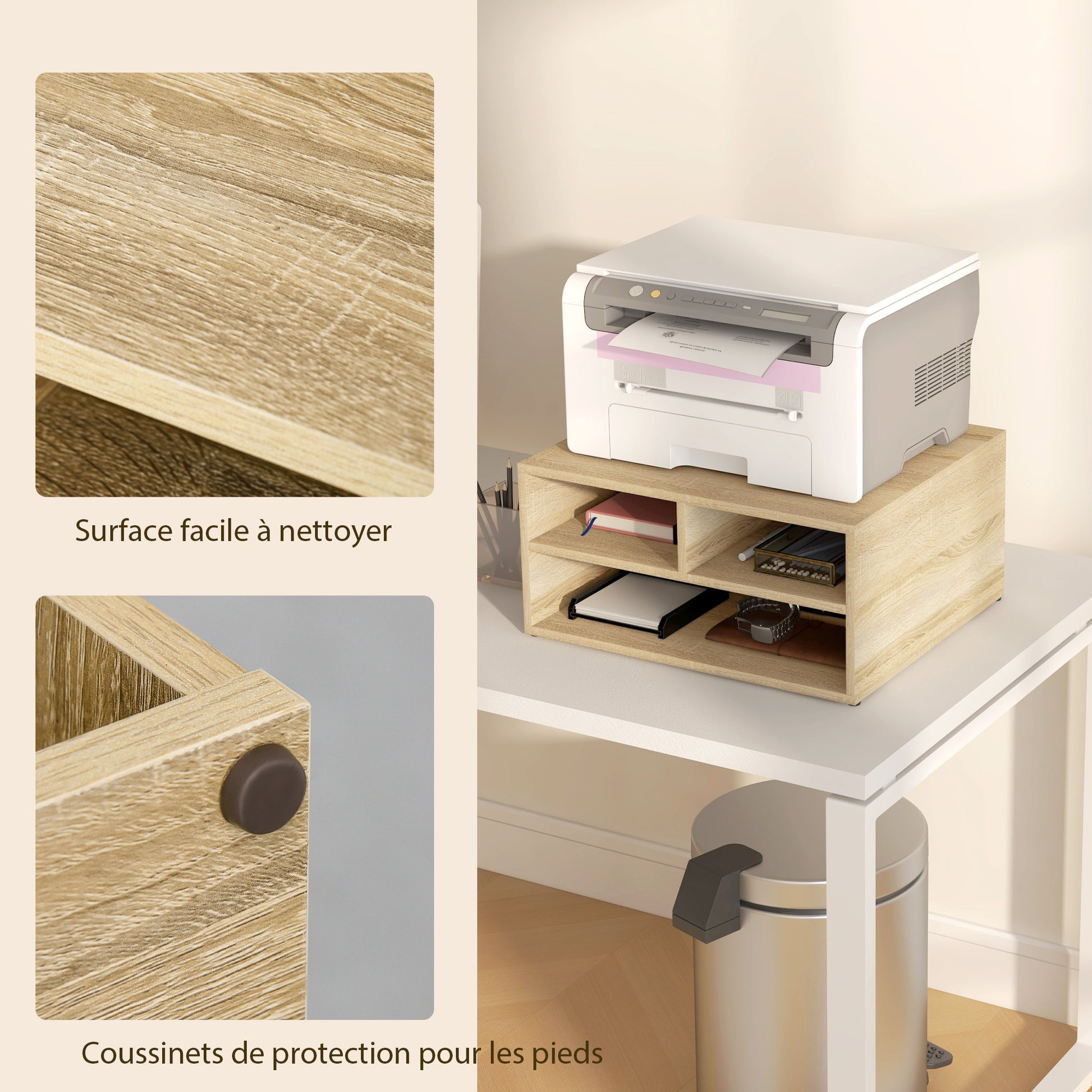 - - SAUGOJIMO VIETA: 3 atviri skyreliai leidžia laikyti daug dokumentų. Spausdintuvo stovo viršuje gali būti laikomas spausdintuvas ar skeneris.