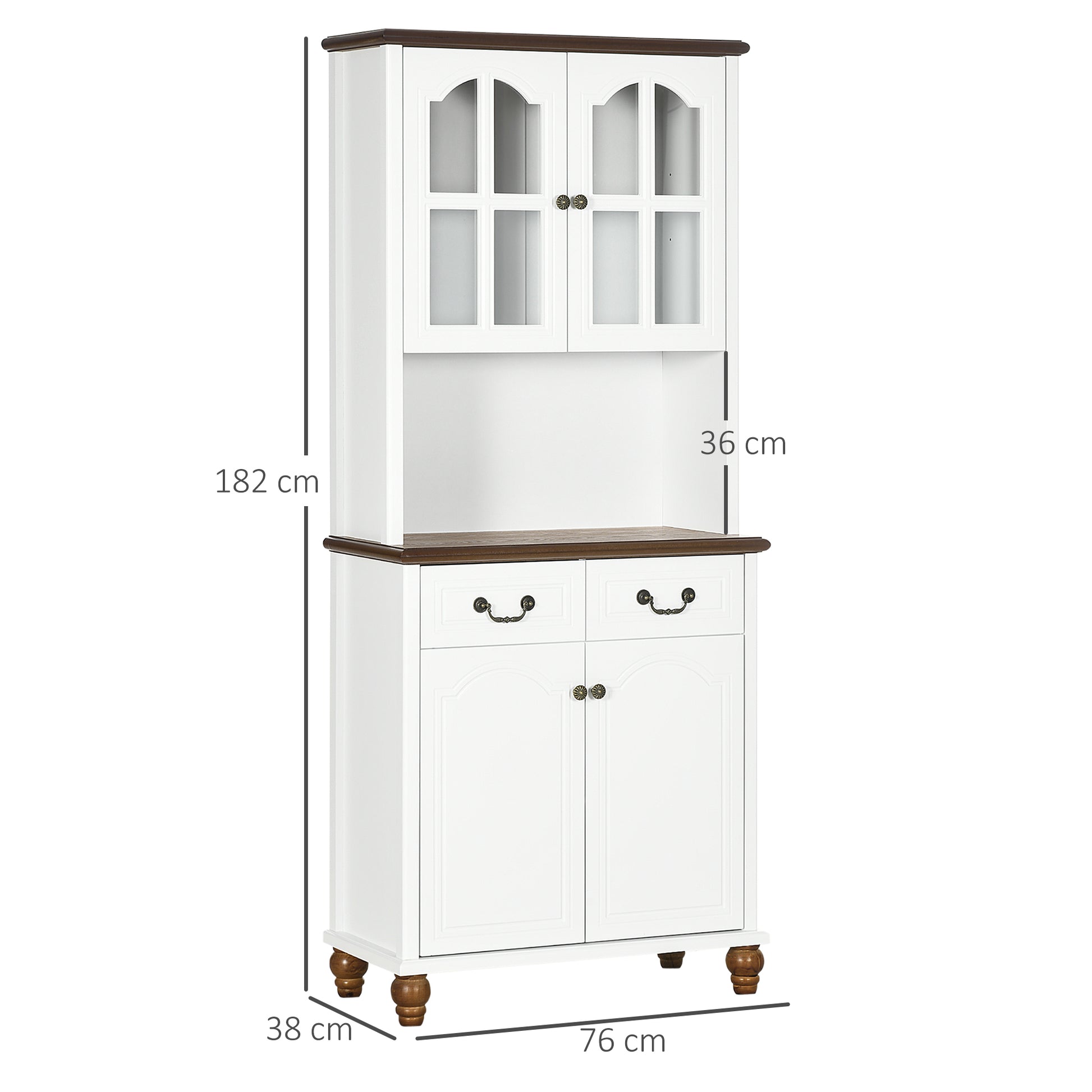 HOMCOM Virtuvės Spinta Aukšta Spintelė su Darbo Paviršiumi, 4 Durimis ir 2 Smegduobėmis, Buffet Spinta Mikrobangų Spinta su Reguliuojamomis Lentynomis, Minkštas Uždarymo Mechanizmas, Balta, 76 x 38 x 182 cm