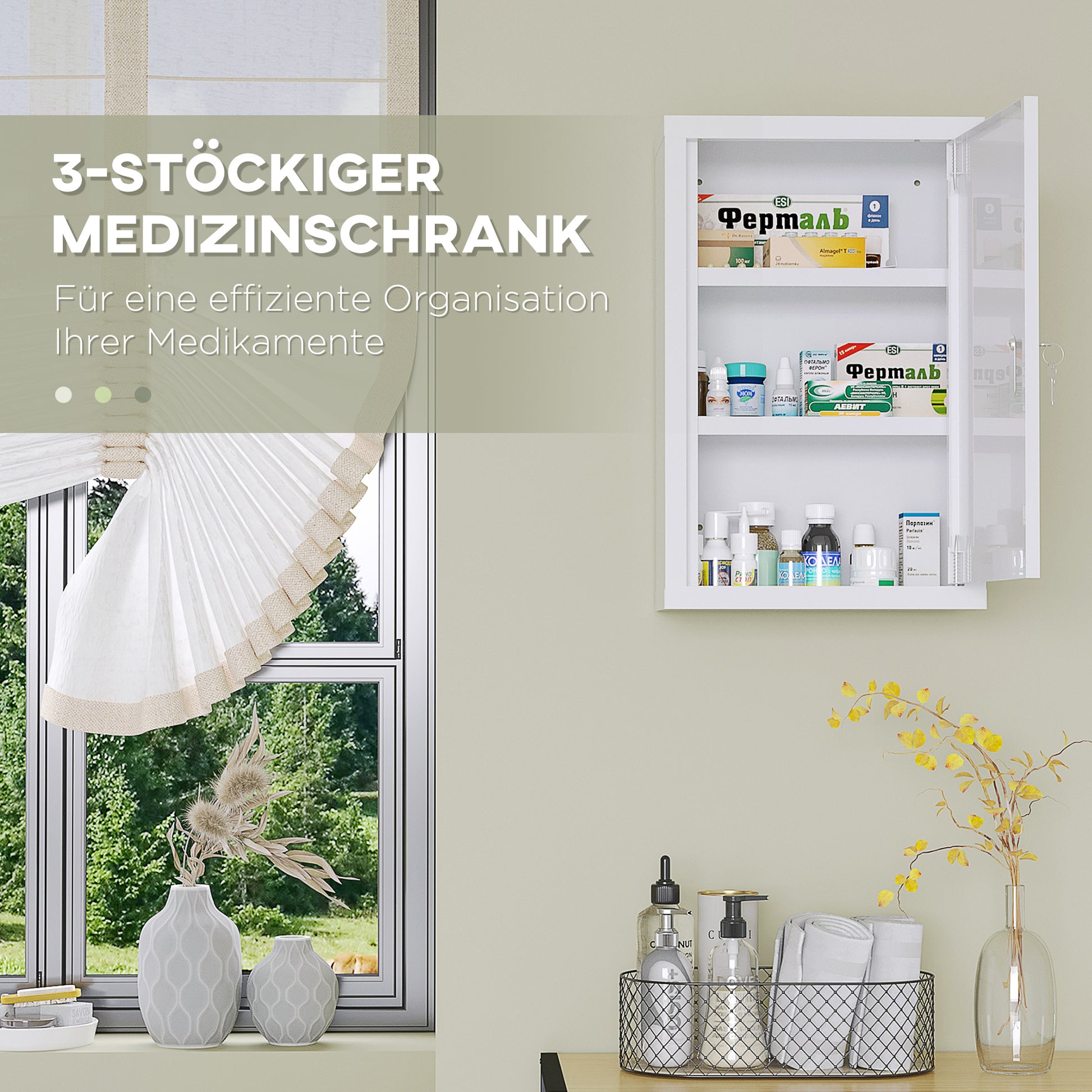 kleankin Vaistų Kabinetas, Vaistinė su 3 Skyriumi, Vaistų Kabinetas, Užrakinamas Pirmosios Pagalbos Kabinetas su 2 Rakteliais, Plieninis, Balta, 30 x 14 x 46 cm