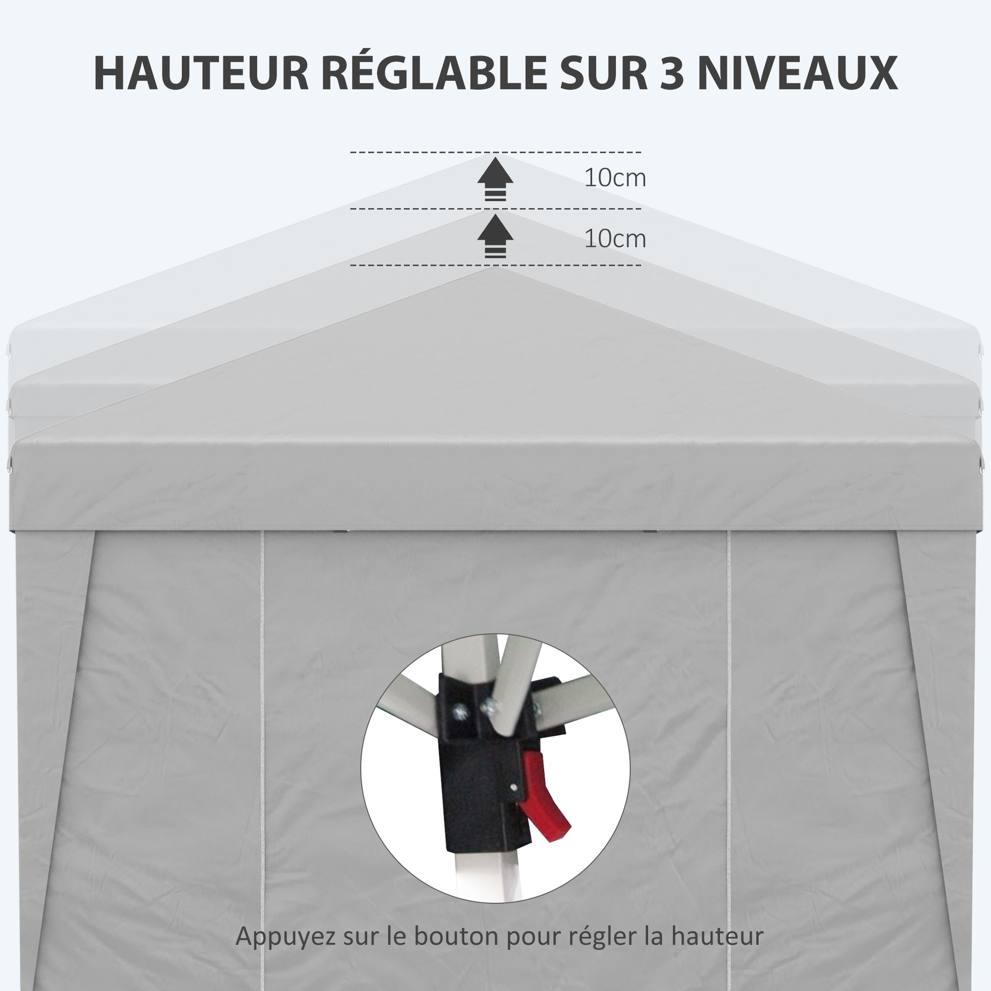 - - Reguliuojamas aukštis: Lengvai pritaikykite savo recepto palapinės aukštį atitinkamai pagal progą. Mūsų paviljonas su šoninėmis sienomis turi reguliuojamas kojas, kurios užsifiksuoja paprastu mygtuko paspaudimu. Kelkite arba žeminkite savo ištraukiamą stogą tarp trijų aukščio nustatymų.