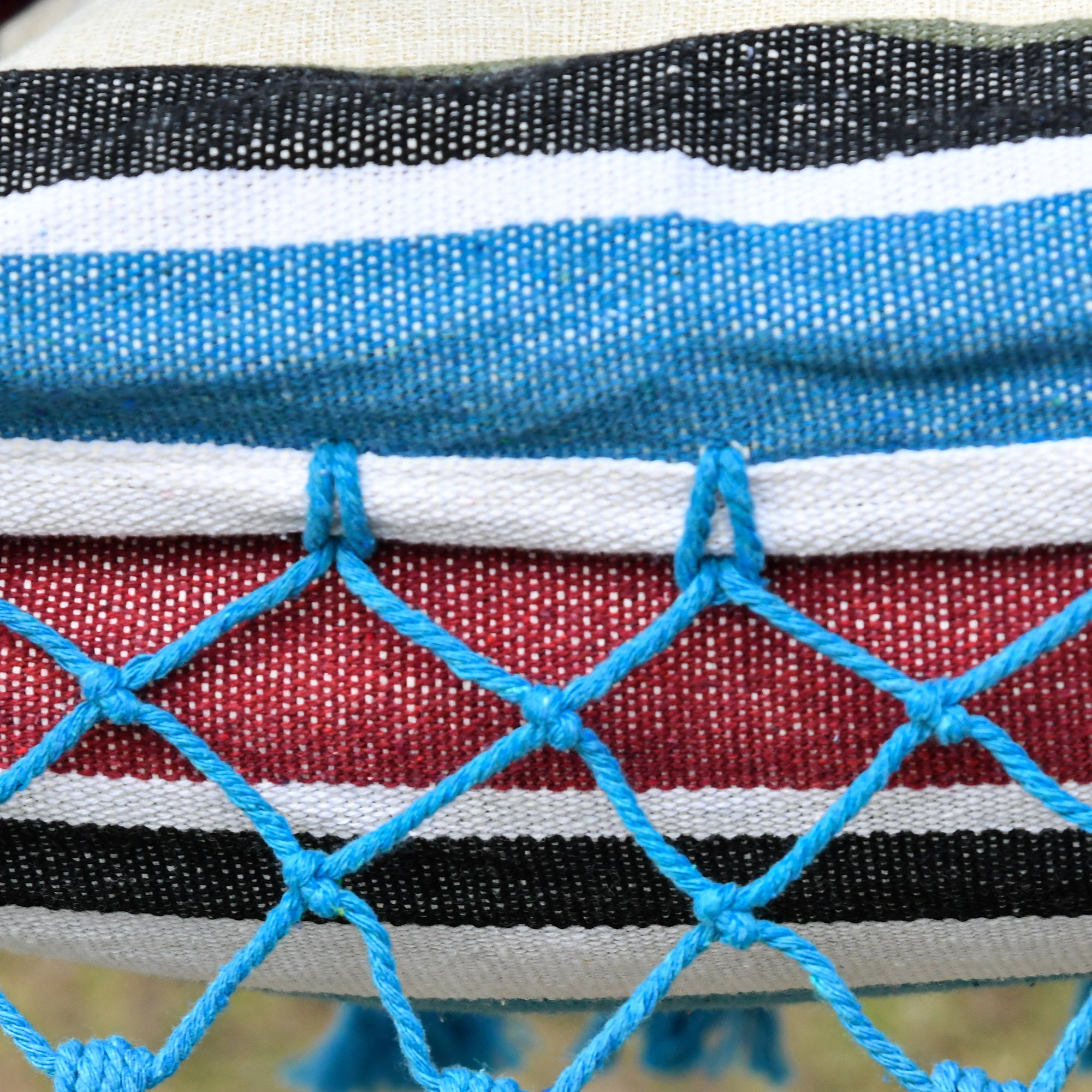- - MODERNUS IR UNIVERSALUS: Naujausias hamakas su gyvybingais daugiaspalviais dryžiais ir dekoratyvine tinkleline struktūra su kutais. Puikiai tinka kelionėms pėsčiomis, stovyklavimui arba poilsiui savo sode, terasoje ar kieme