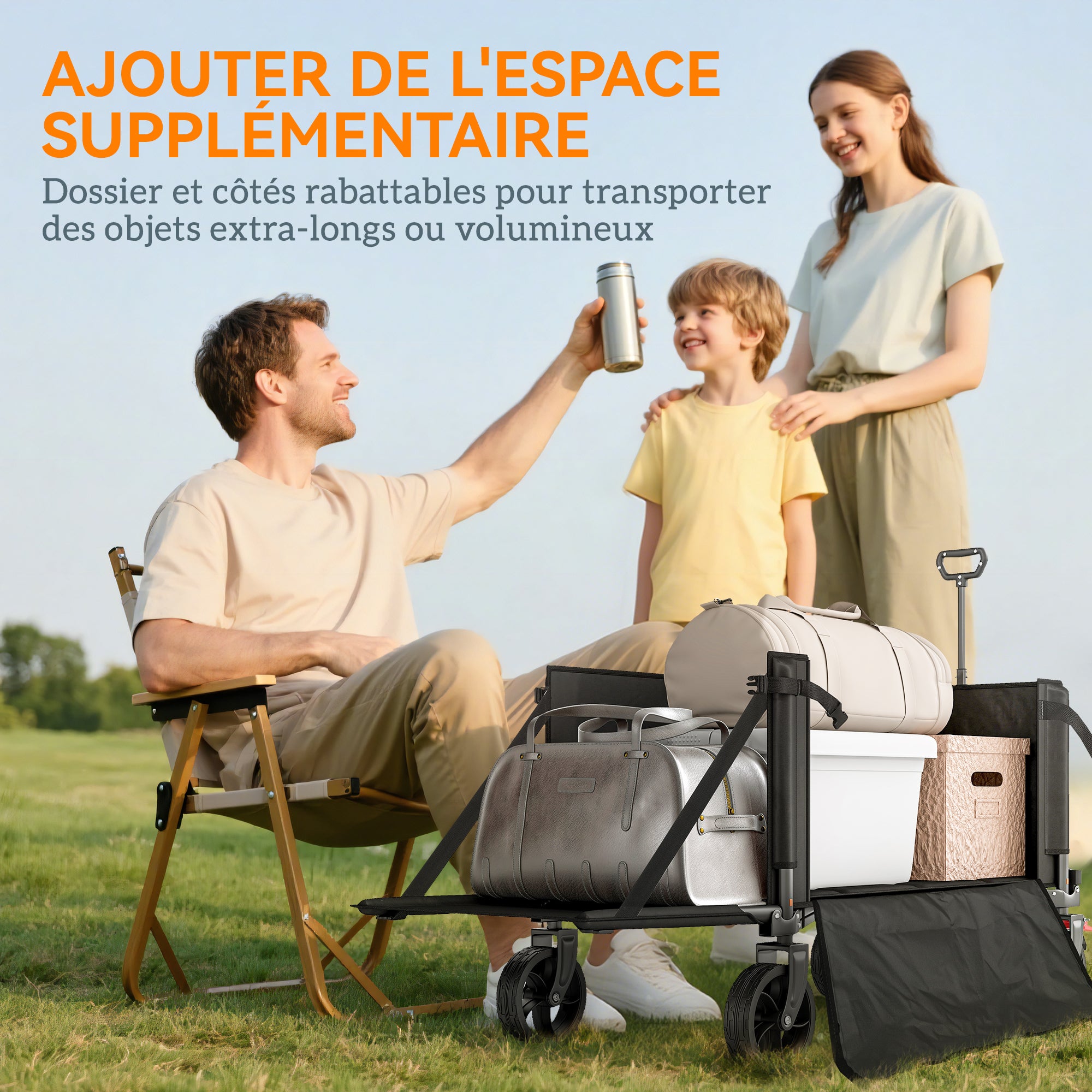 - - MODULIARUS DIZAINAS: Sulankstoma atlošo ir šonų konstrukcija puikiai tinka ilgų ar didelių daiktų transportavimui stovyklaujant ar festivaliuose, taip pat turi šonines kišenes mažesniems aksesuarams laikyti