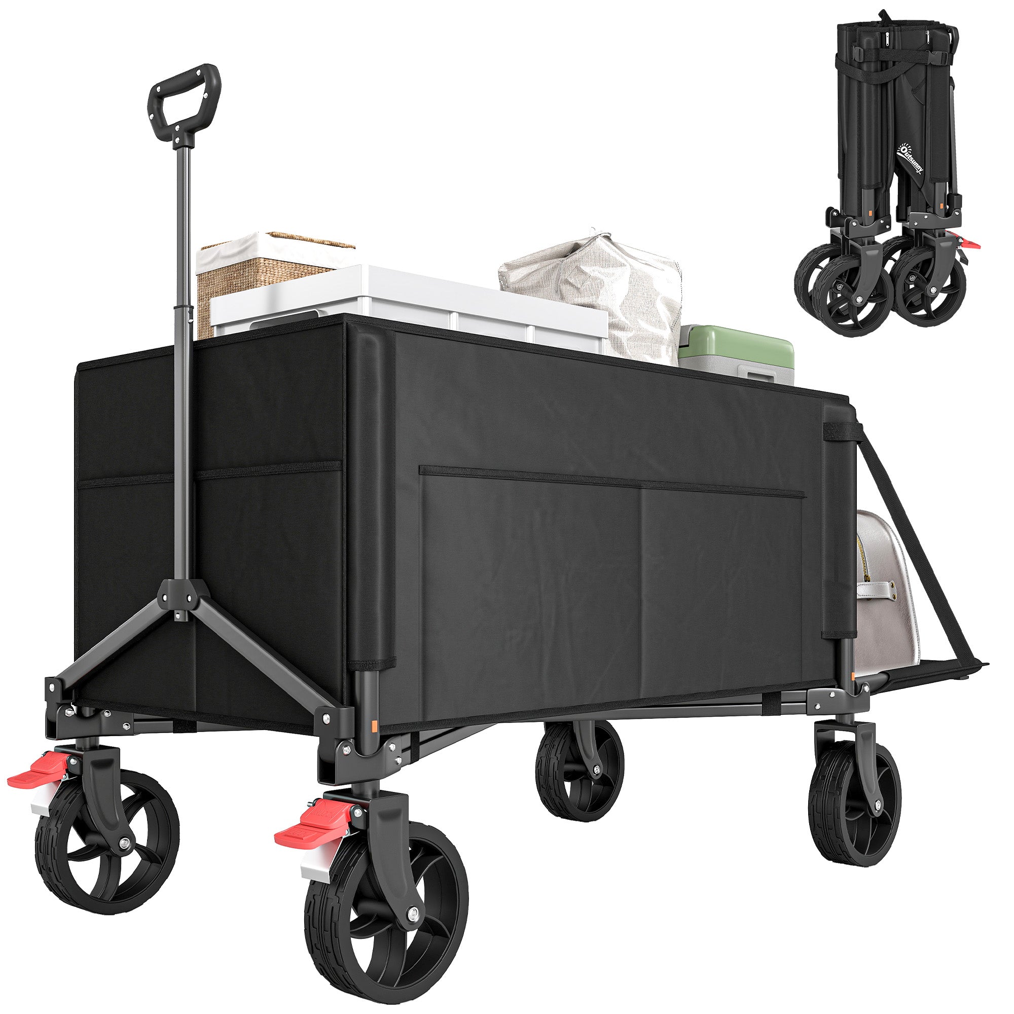 Outsunny Sulankstomas Paplūdimio Transporto Vežimėlis 155L, sodo vežimėlis su atviromis pusėmis, reguliuojama rankena ir šoniniais kišenėmis, maksimalus svoris 100 kg, telpa stovyklaujant, apsiperkant, sodininkaujant, lauke, juodas