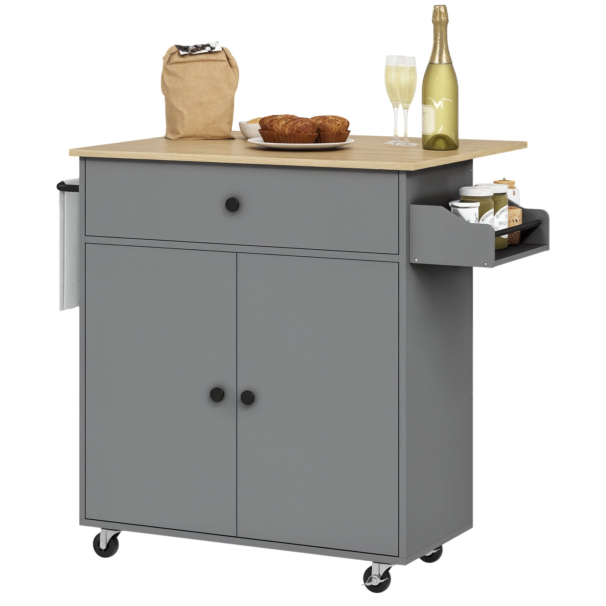 HOMCOM Virtuves sala ar salokāmu lapu – Virtuves ratiņi ar riteņiem, 2 durvis, atvilktne, garšaugu plaukts, dvieļu turētājs un regulējams plaukts 106x42x87 cm Pelēks un Ozolkoks
