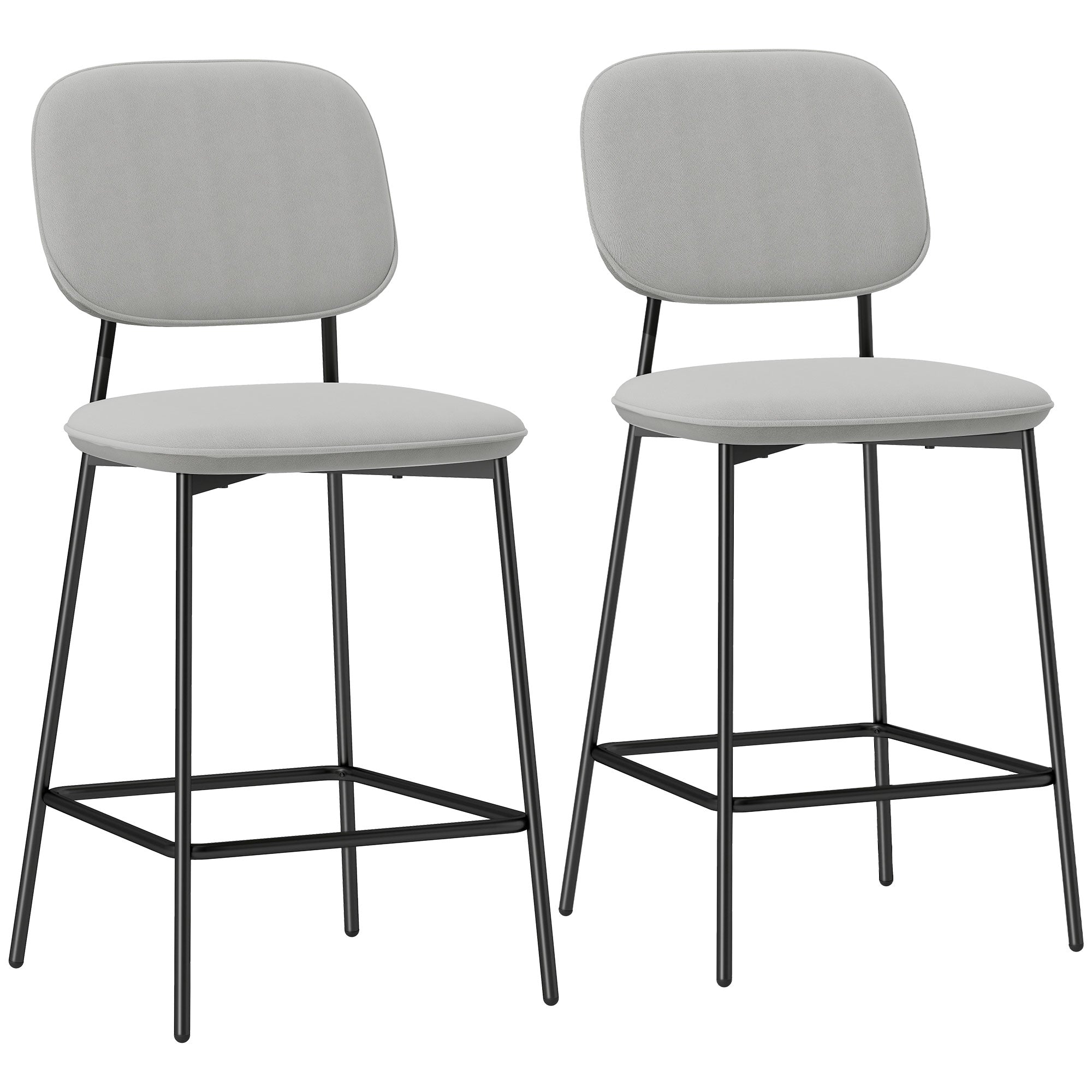 HOMCOM 2 augsto bāra krēslu komplekts ar atzveltni un kāju balstu, apvilktu ar samtu, tērauda rāmja modernie augstie krēsli virtuvei gaiši pelēkā krāsā