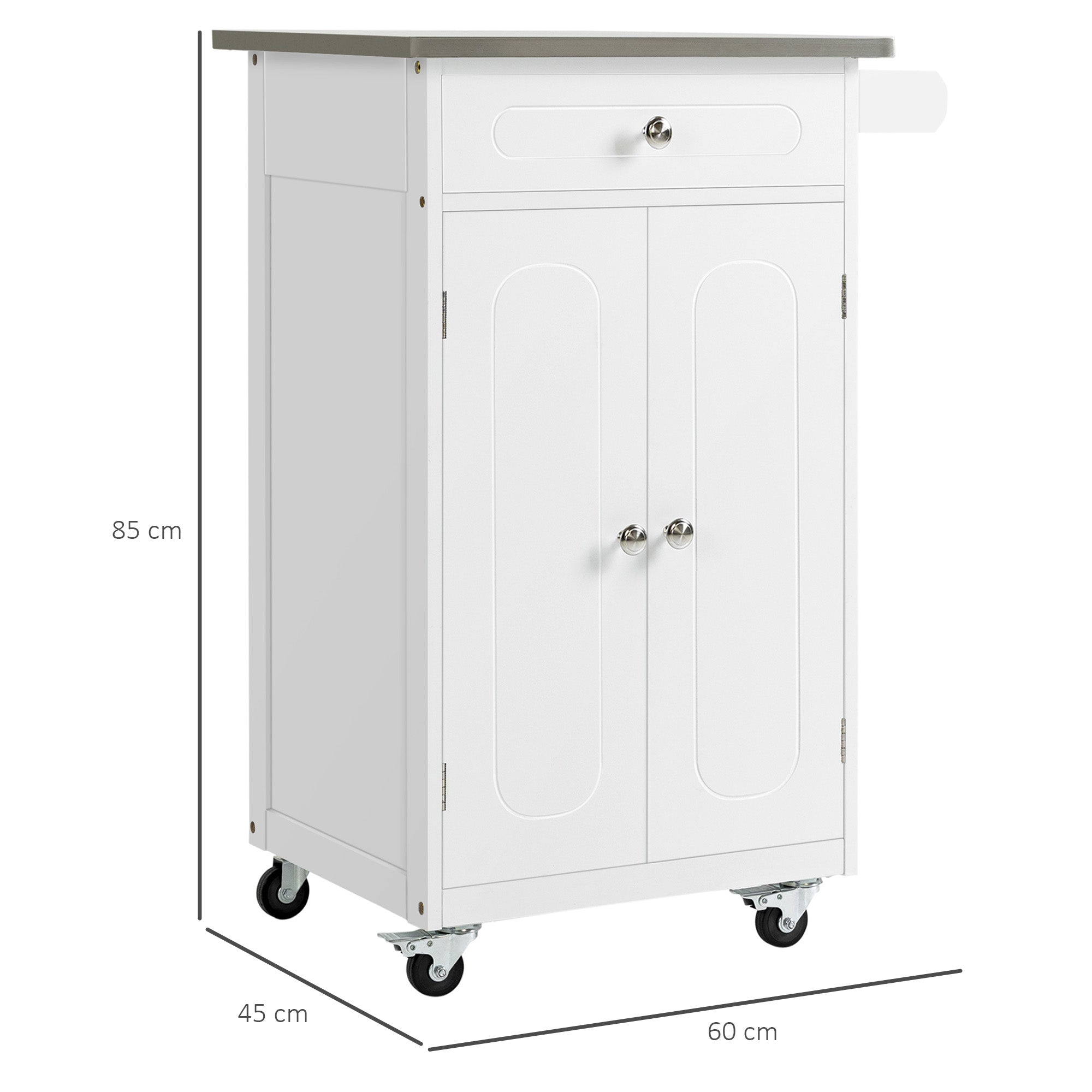 HOMCOM Balts MDF un Nerūsējošā Tērauda Virtuves Saliekamais Ratiņš ar Ritenīšiem - Daudzfunkcionāls, 1 Atvilktne, Skapis ar 2 Durvīm un Dvieļu Turētājs