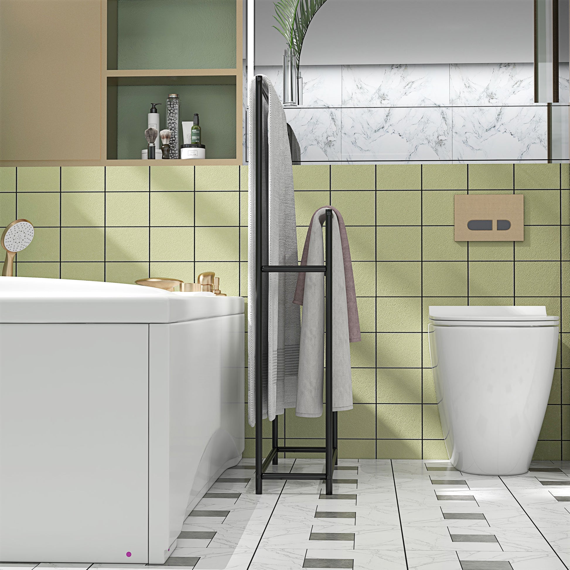 - - Augstas kvalitātes metāla konstrukcija: Izgatavots no izturīga metāla rāmja ar papildus sānu statņiem, šis dvieļu turētājs nodrošina augstu stabilitāti. Krāsotā virsurface efektīvi pasargā no rūsas no ūdens šļakatām
