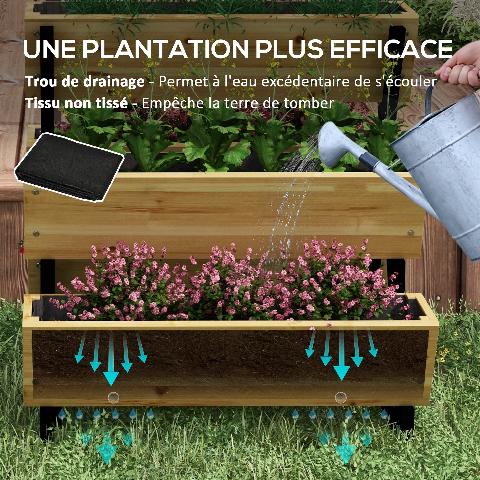 Outsunny Kvadrātveida Paceltais Stādītājs uz Kājām 3 līmeņi 5 konteineri - izm. 75L x 78W x 77H cm Laistīšanas Ievietojumi, Kanalizācijas Filcs, Egle