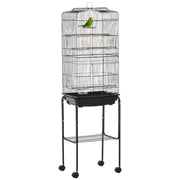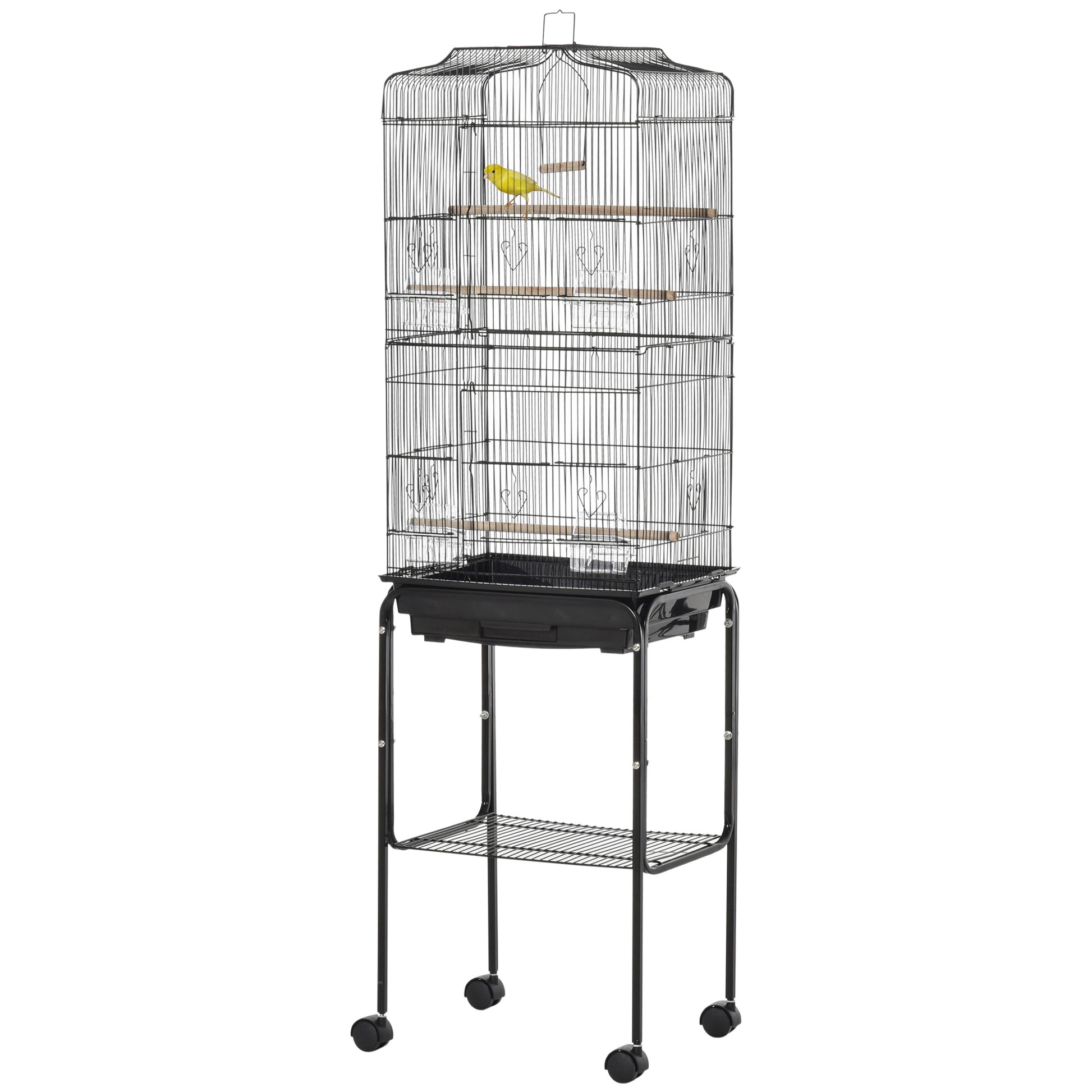 PawHut Putnu būris ar riteņiem 46.5x36x157 cm Metāla putnu būris ar durvīm, 4 barotājām, 3 mietiem, izņemamu paliktni un uzglabāšanas plauktu kanārijputniem un pīrāgiem melnā krāsā
