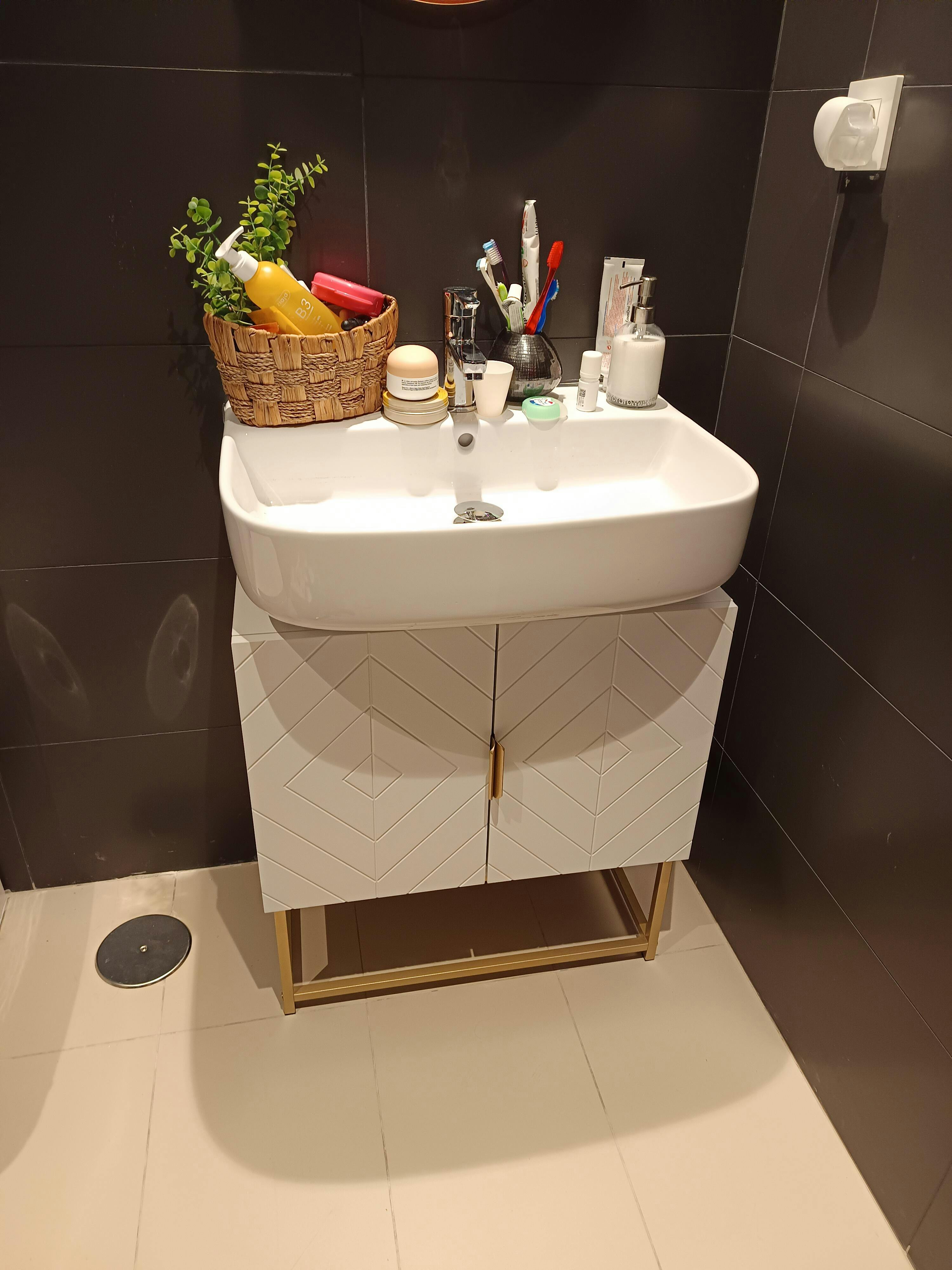 - - ELEGANT ONTWERP: Deze onderkast heeft een origineel ontwerp met geometrische patronen, een gouden basis en elegante handgrepen die eenvoudig elk decor in uw badkamer aanvullen.