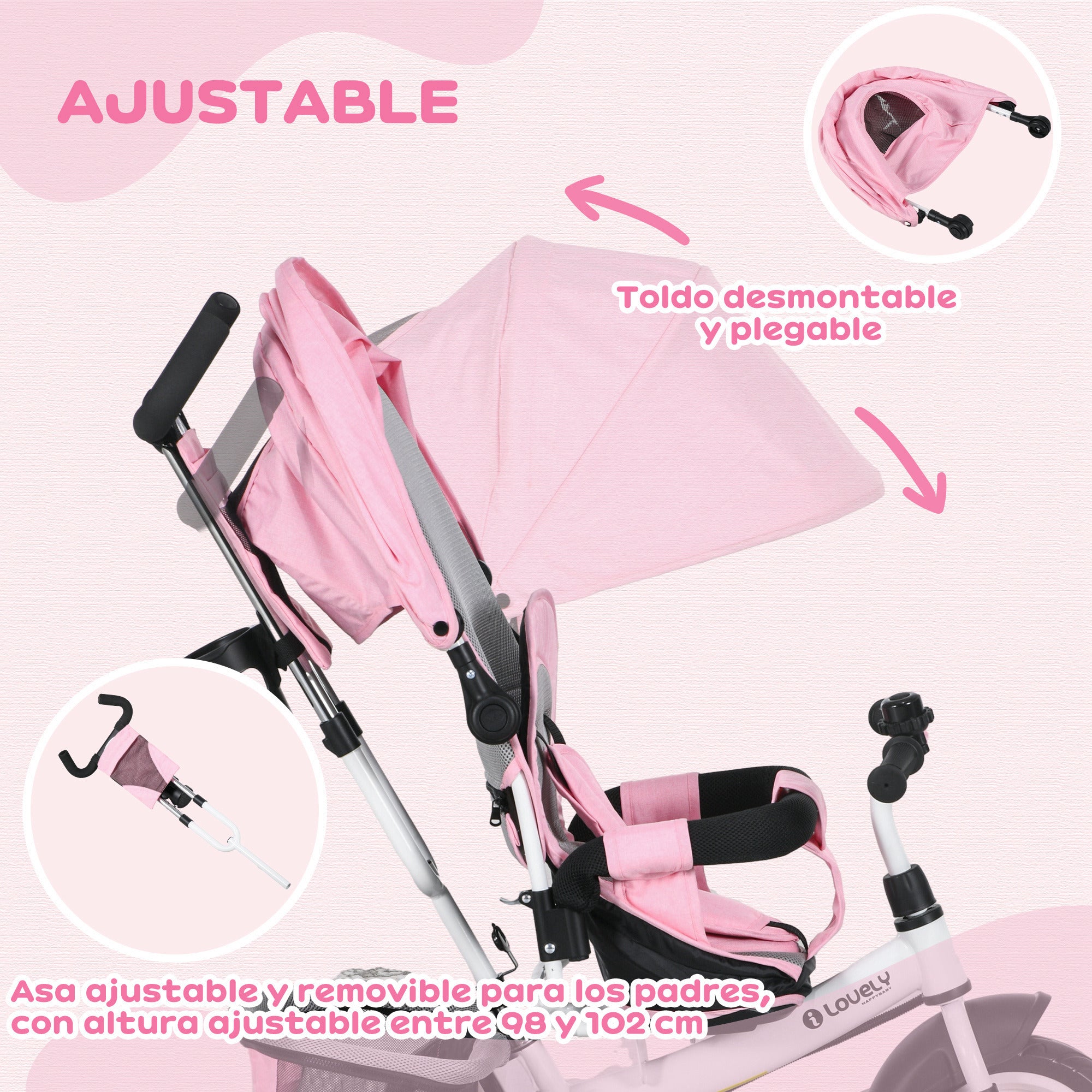 HOMCOM Evoluerende Baby Driewieler voor Kinderen met Opvouwbare Luifel, Uitschuifbare en Afneembare Handgreep, Moeders Tas en Fleshouder 102x49x102 cm Roze