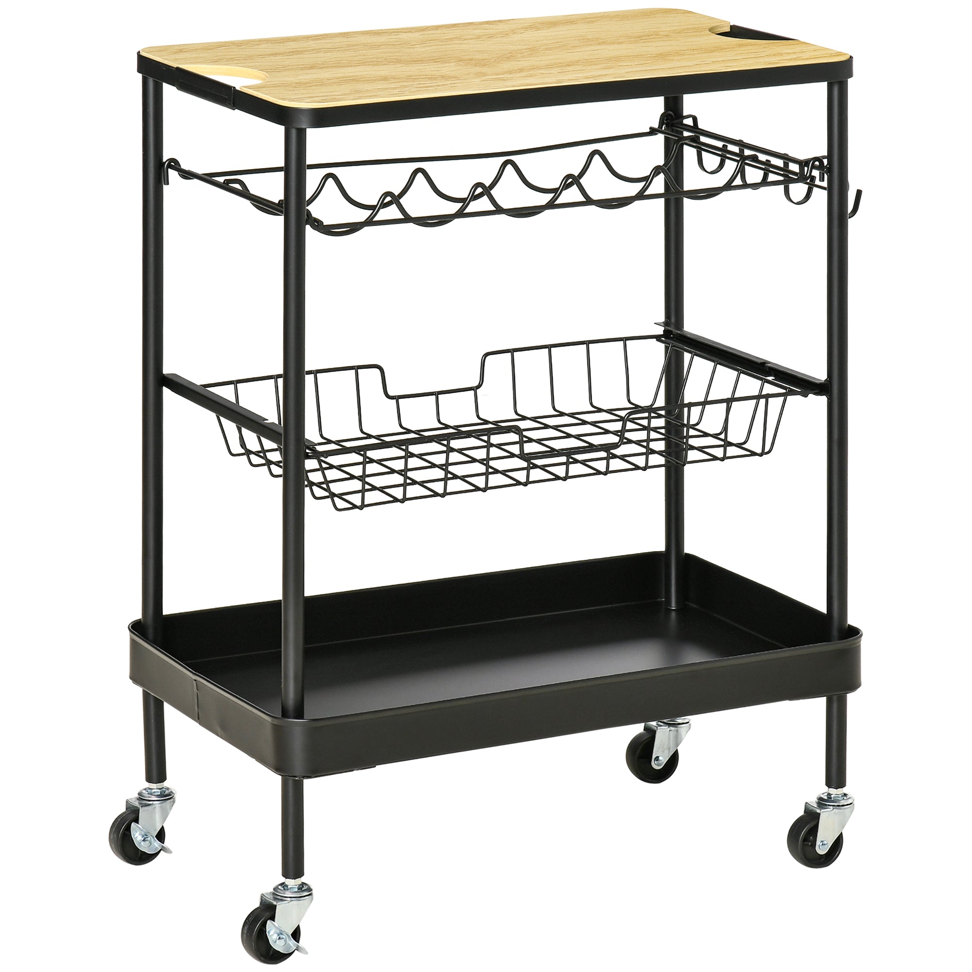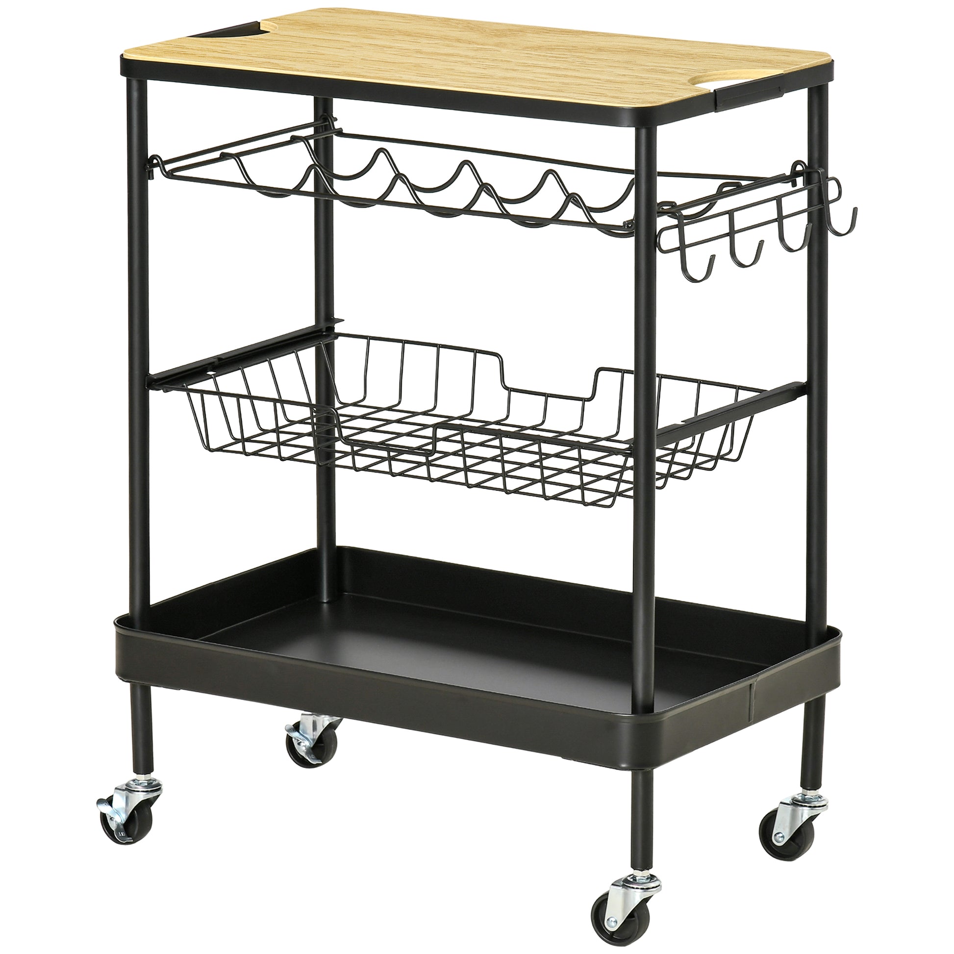 HOMCOM Keukenwagen met Wielen Multi-Functionele Serveerwagen met Flessenhouder Verwijderbare Mand En 4 Haakjes voor Eetkamer Woonkamer 60,5x35,5x75 cm Zwart en Eiken