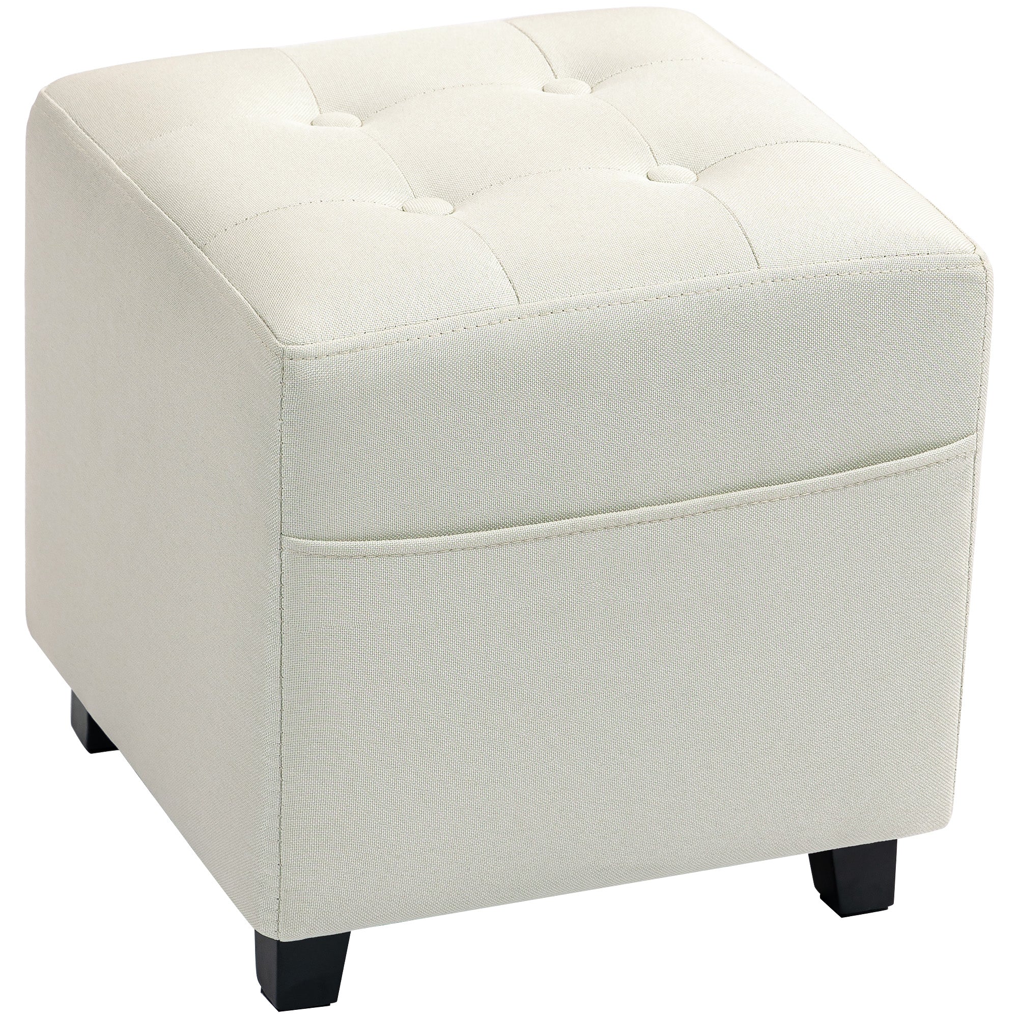 HOMCOM Voetensteun voor de Woonkamer Laag Vouwvoetje Bekleed met Linnen Vierkante Ottomaan met Zijvak Gevoerde Knopen en Rubberhout Onderstel voor Woonkamer Slaapkamer Crème