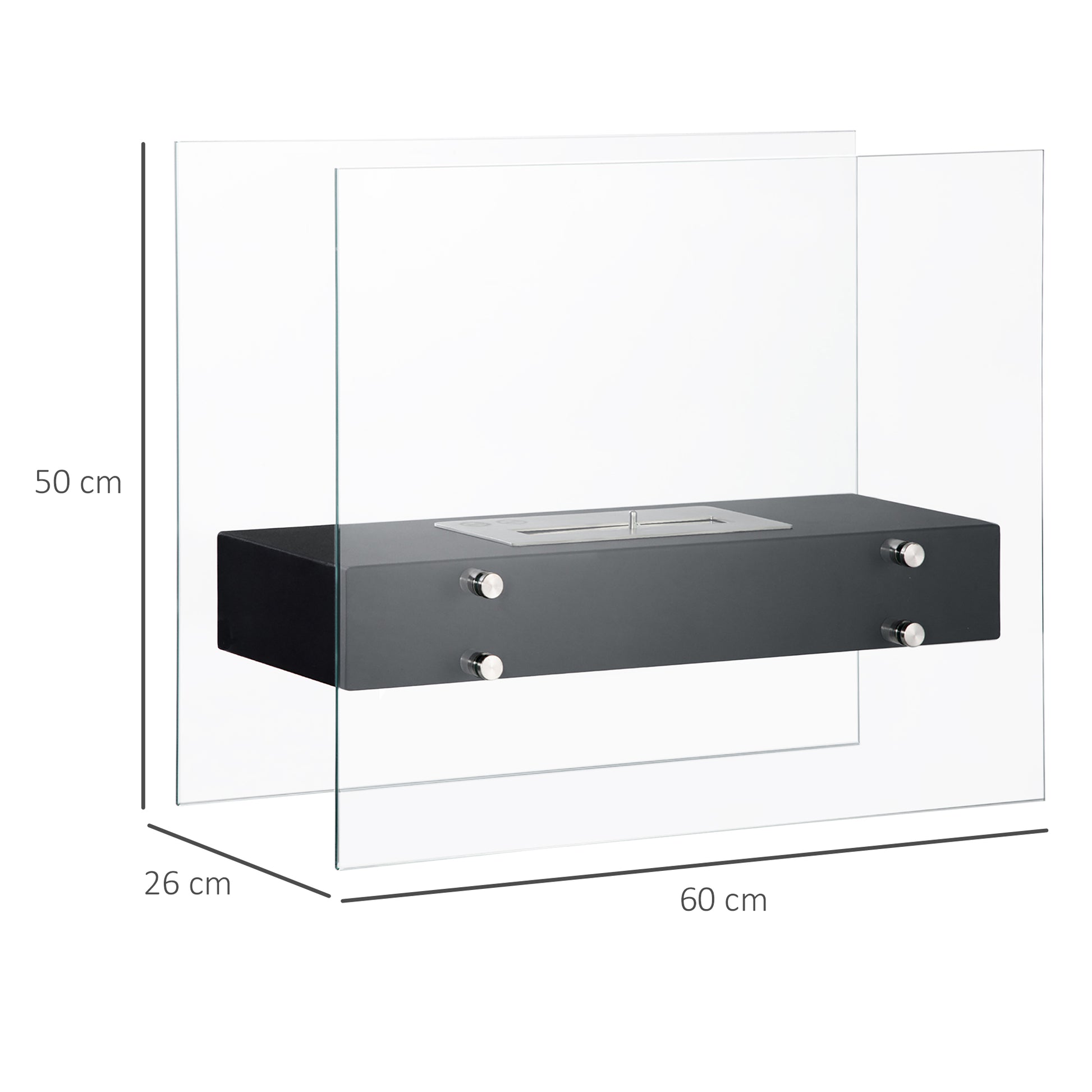 HOMCOM Vrijstaande Ethanol Haard van Metaal en Gelaagd Glas met 1,5 L Reservoir, ca. 3 uur brandtijd, Geschikt voor 25 m² - dim. 60L x 26B x 50H cm