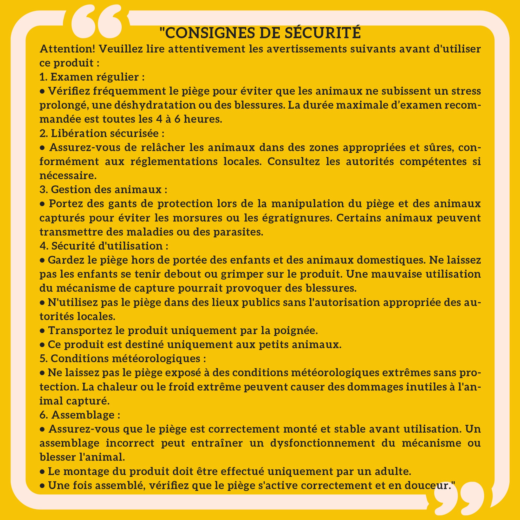 - - EENVOUDIG IN GEBRUIK: Plaats de val op het pad van het dier en laad het aas binnenin de drukplaat, zodra de plaat gevuld is, wordt de val geactiveerd en valt de deur naar beneden en vangt het dier.