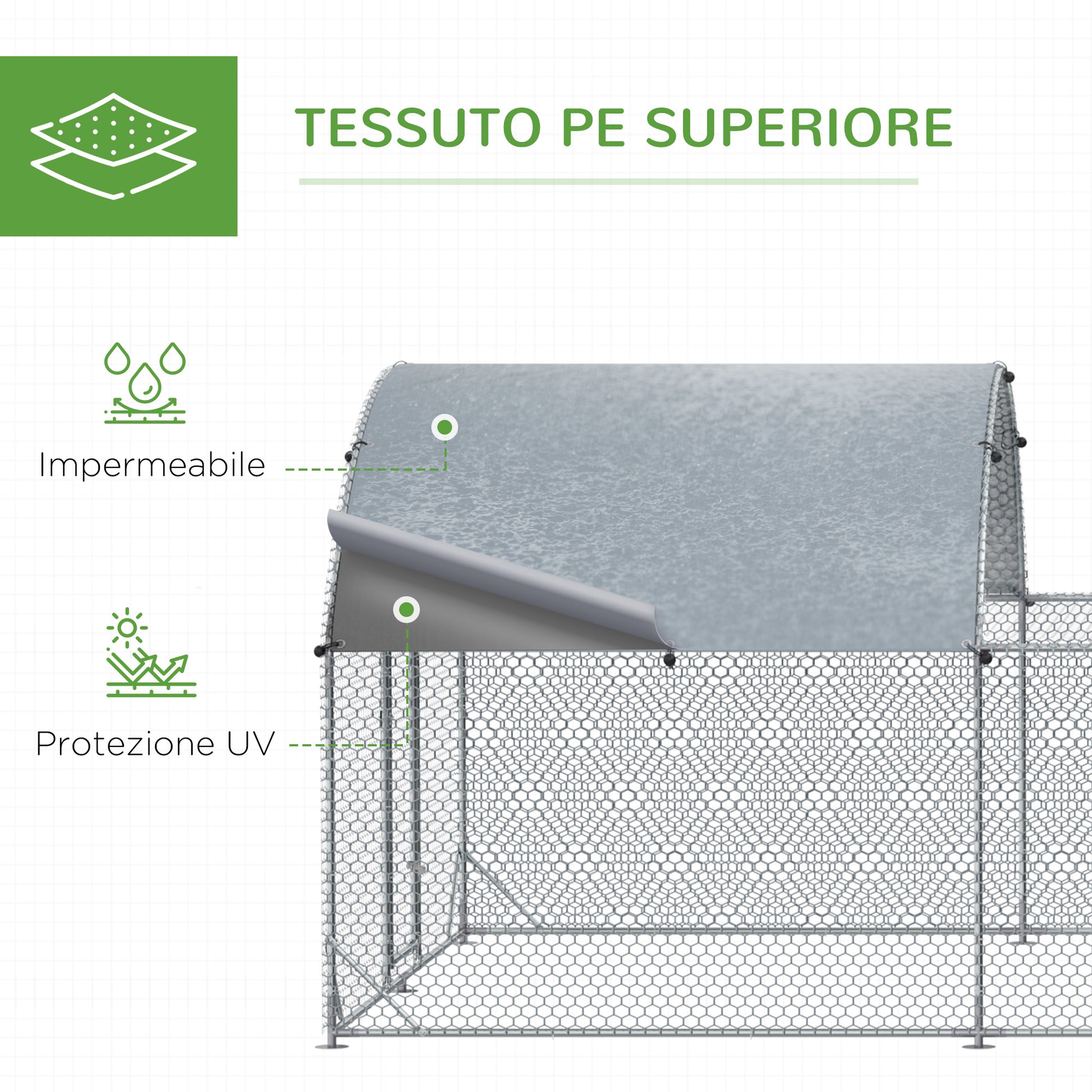- - DAK: De bedekking van het kippen- en konijnenhok creëert een aangename schaduwrijke ruimte om je dieren te beschermen tegen de zon of lichte regen. De behandeling van de PE-bedekking zorgt voor waterdichtheid en UV-bescherming.