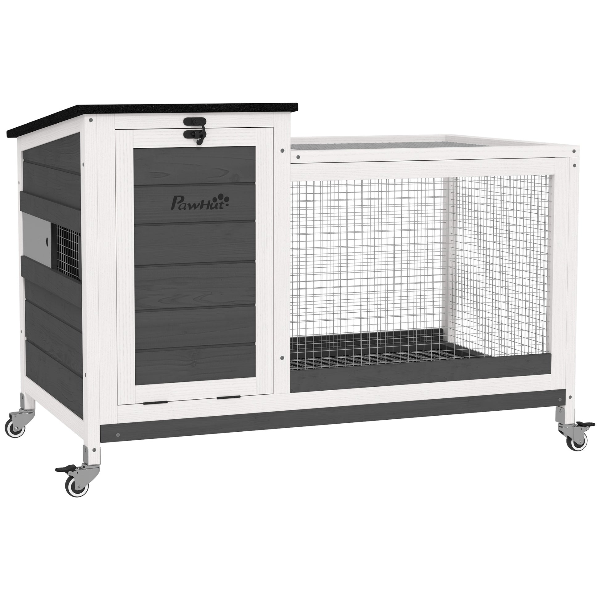 PawHut Houten Konijnenhok met Ren, Wielen, Vouwbare Dak, Uittrekbare Lade, Metaalrooster, Winterbestendig Caviahok, Konijnenkooi voor Binnen en Buiten 92x52x67 cm Donkergrijs