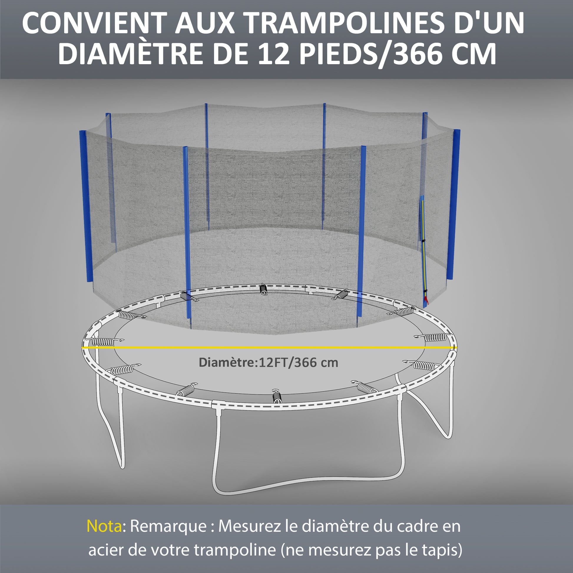 - - SPECIFICATIES: Totaal afmetingen: Ø366 x 180H cm. Geschikt voor een 366 cm rond trampolineframe met 8 rechte stangen. (Stangen niet inbegrepen)