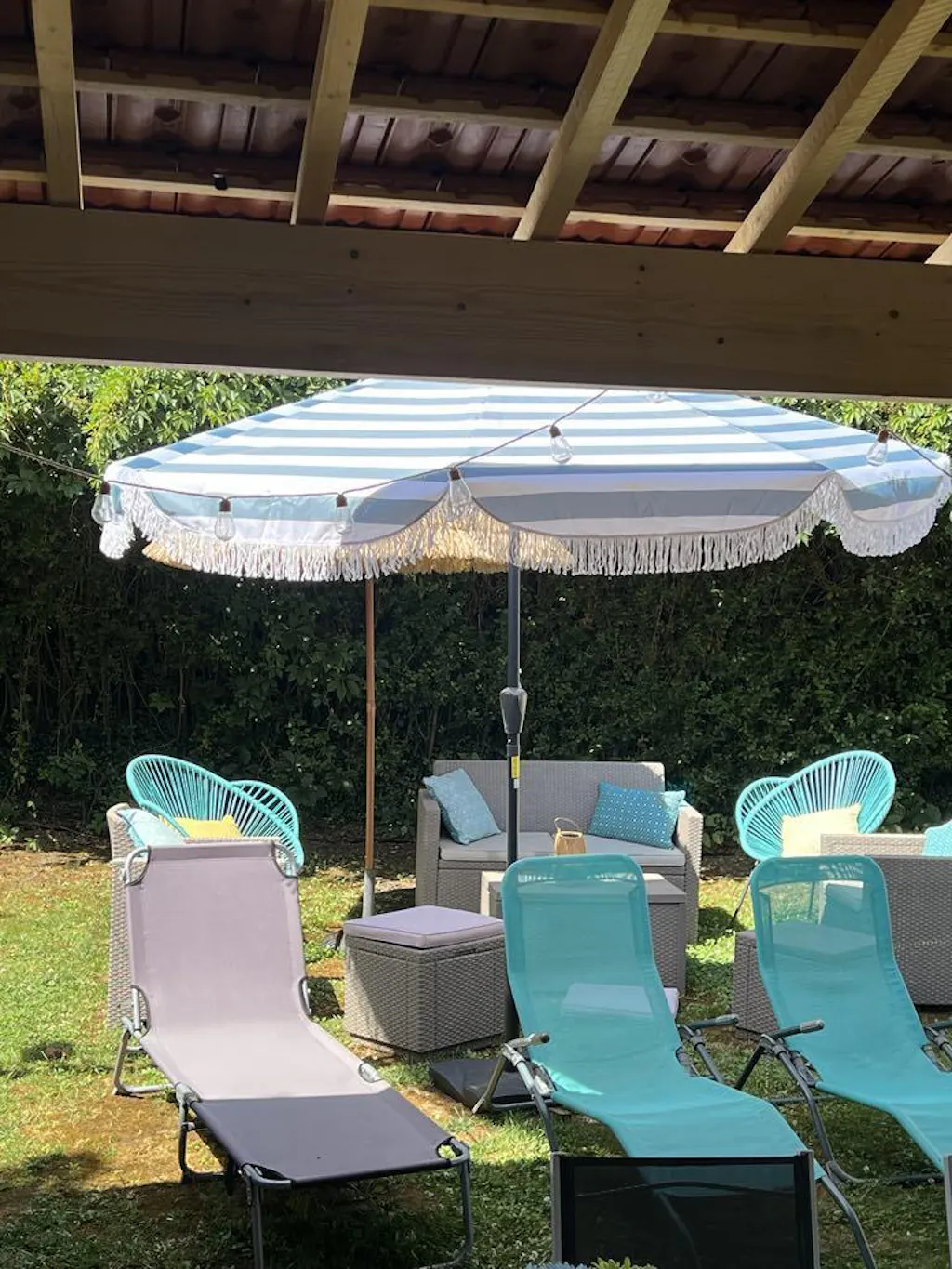- - STAY IN THE SHADE: Enjoy a shaded area with our 2.69 m terrace umbrella, ideal for fitting in a table or on a standalone base. Its elegant fringe design adds a refined touch to your outdoor space.