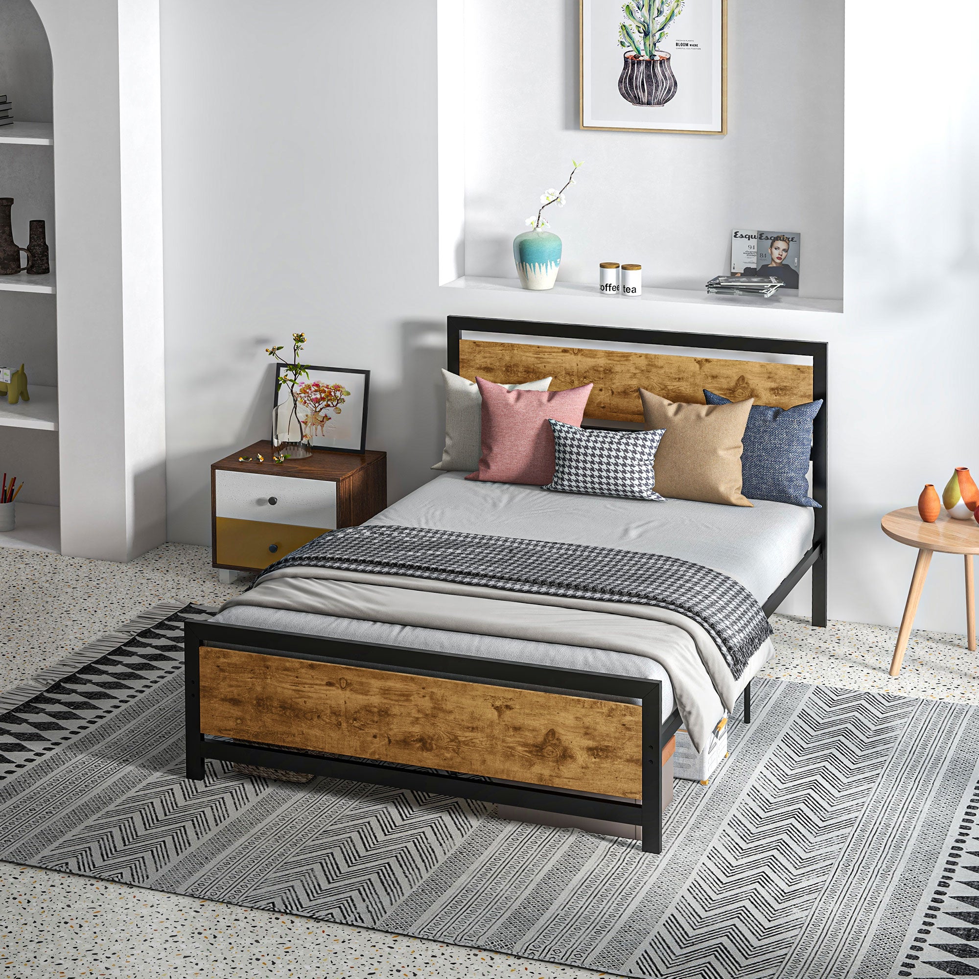 - - RETRO LOOK: The black metal frame with vintage rustic wood headboard and footboard enhances your bedroom with an original industrial style.