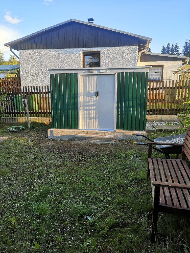 • - Vodoodolná: Vďaka streche z oceľového plechu s plastovým krytom je záhradná kôlňa odolná voči poveternostným podmienkam a poskytuje dobrú ochranu pred dažďom, vetrom a prachom. Na šikmej pultovej streche sa nehromadí žiadna zrážka.