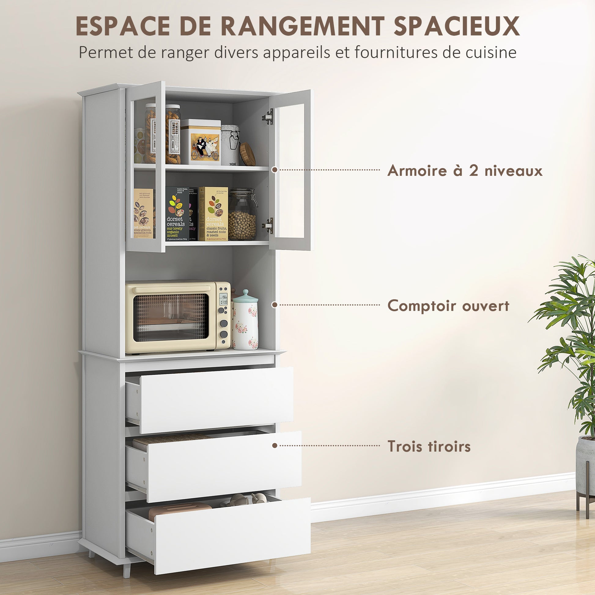 - - VIACÚLOŽNÝ PRIESTOR: Kuchynská skriňa s dostatkom úložného priestoru: 1 skriňa s 2 sklenenými dverami s 1 poličkou, 1 veľká centrálna nika a 3 zásuvky - Praktická veľká pracovná doska na varenie alebo umiestňovanie dekorácií, riadu, mikrovlnky atď.