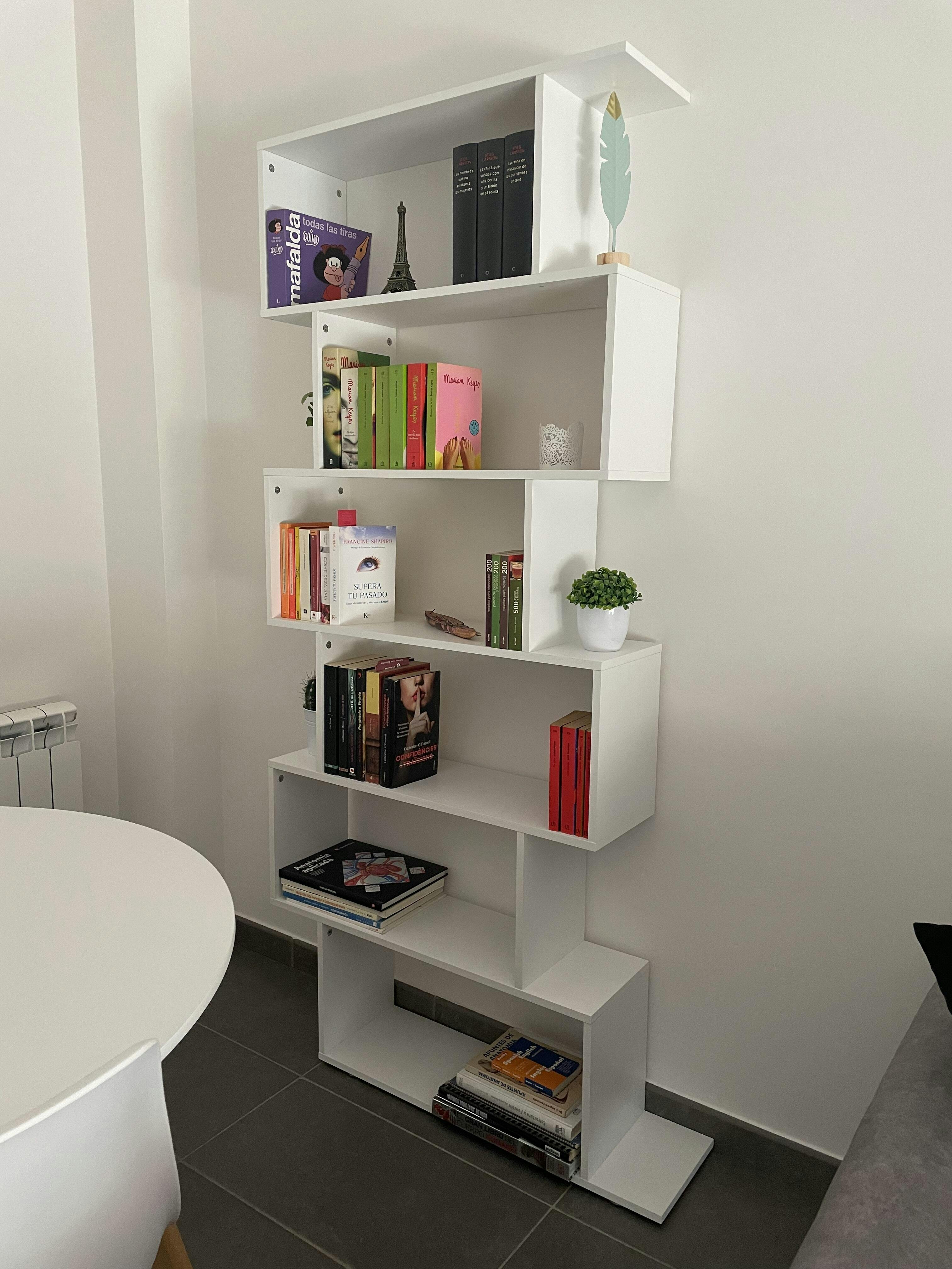 Táto S-tvarovaná knižnica môže byť použitá ako polica alebo skriňa vo vašej domácnosti, spálni, kancelárii a štúdiu. Naše police a knižnice sú vyrobené z kvalitných drevotrieskových dosiek a sú odolné proti poškriabaniu. Táto knižnica má 6 políc, čo je jednoduchý spôsob, ako usporiadať knihy, DVD, rámy s fotkami a dekorácie do domácnosti.