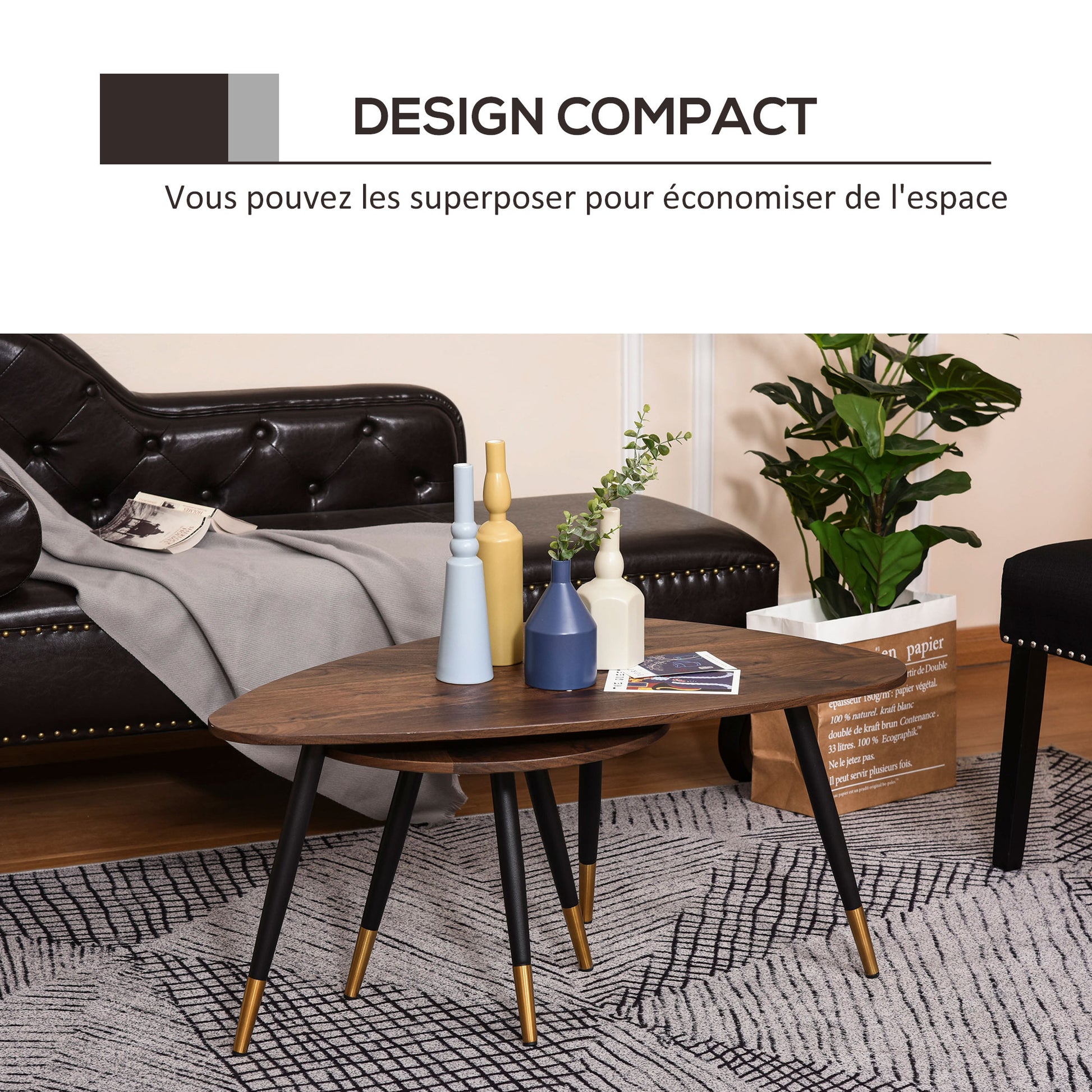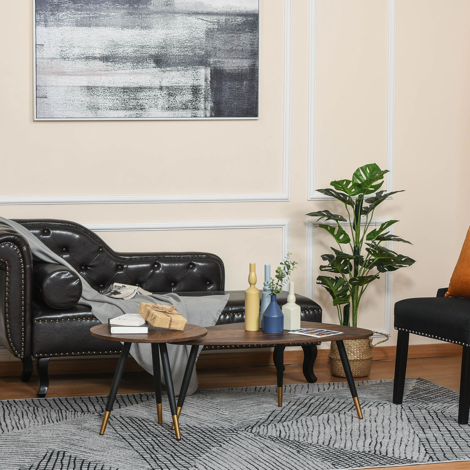 HOMCOM Sada 2 Art Deco štýlových konferenčných stolíkov s užšími kovovými nohami, čierne s čočkami zlato a MDF s tmavým teakovým drevom