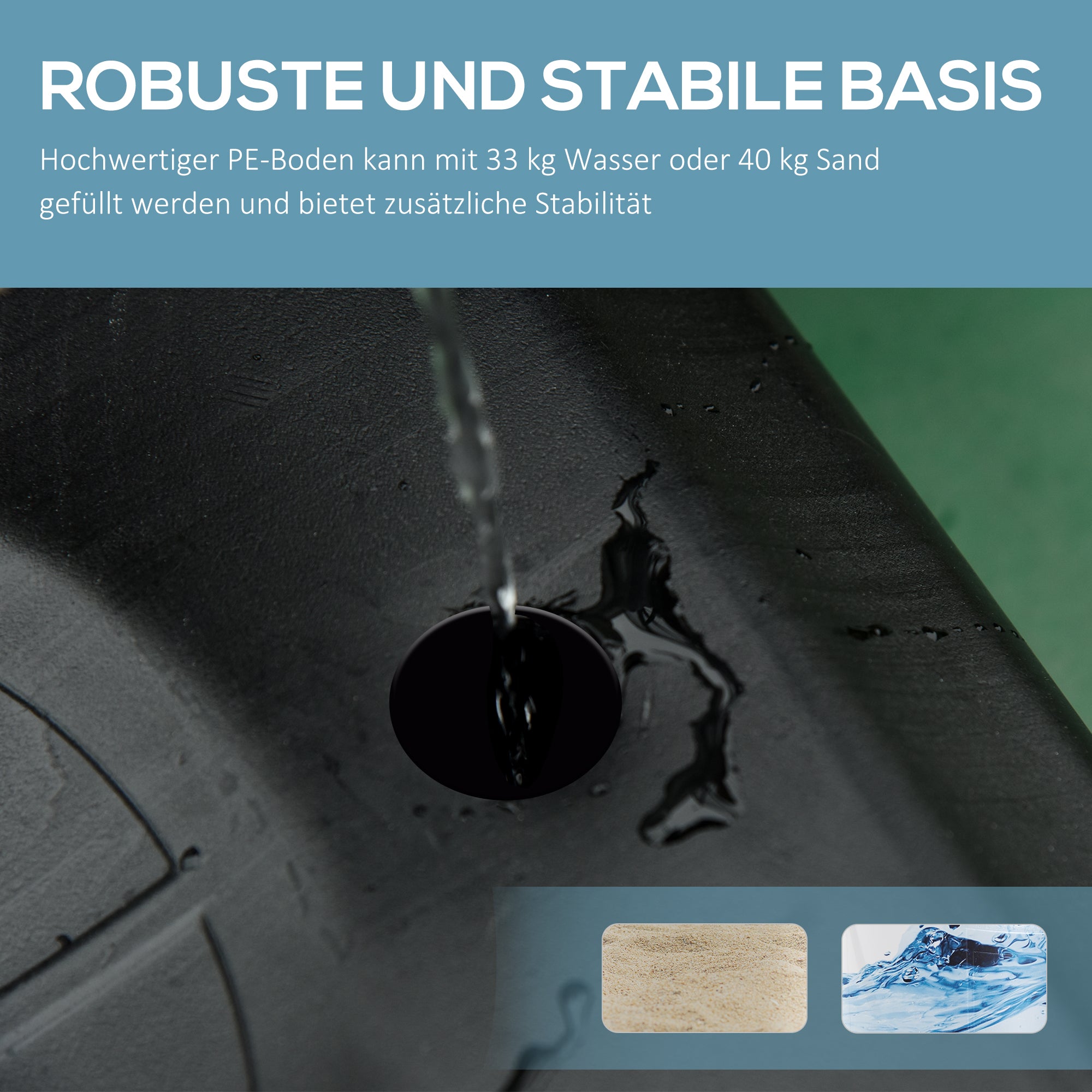 - - Naplnený základ: Až 30 kg vody alebo 40 kg piesku, pre stabilnú podporu. Ľahko prenosný a pohyblivý po vyprázdnení. Integrovaný držiak na zadnej strane basketbalového koša pre pohodlné uskladnenie lopty