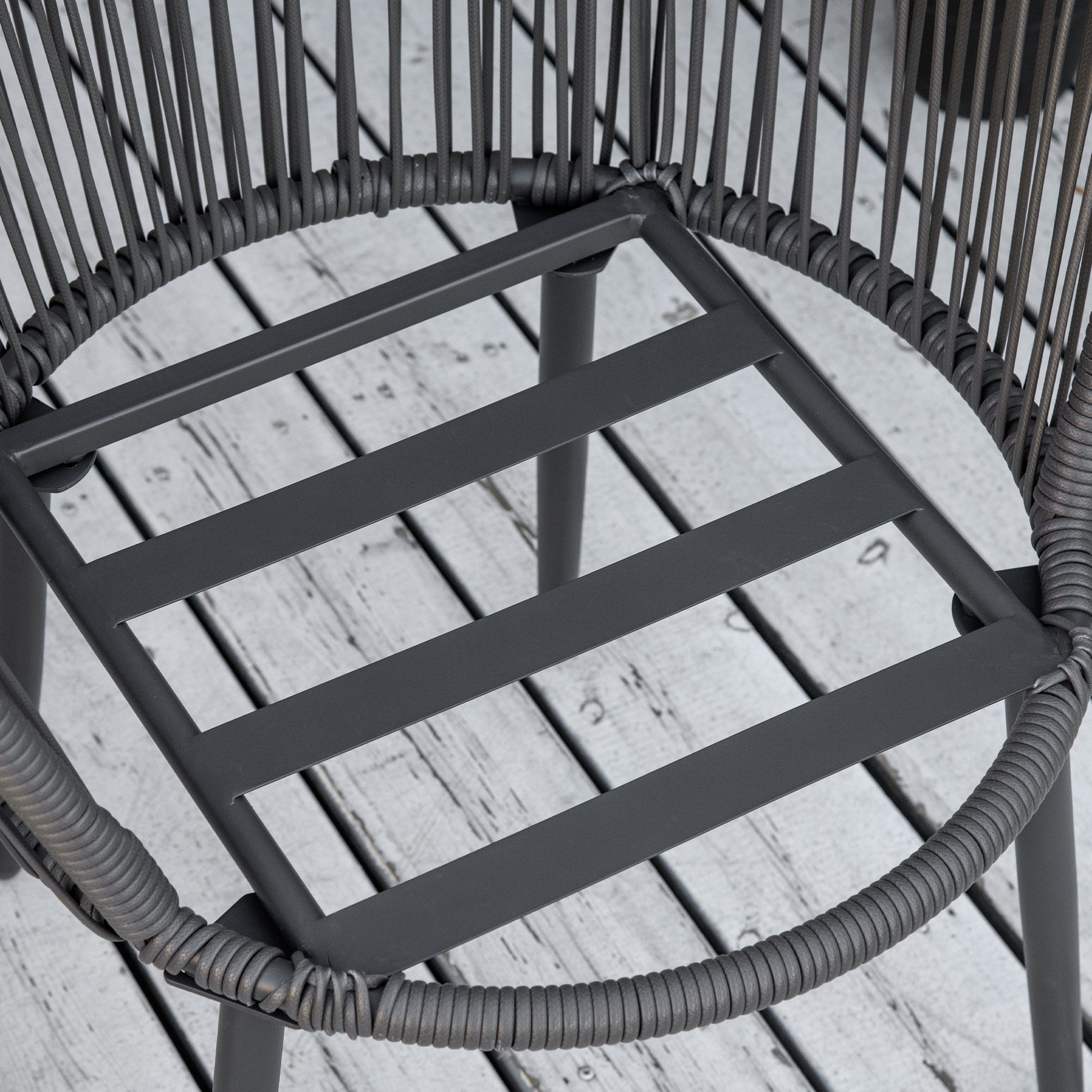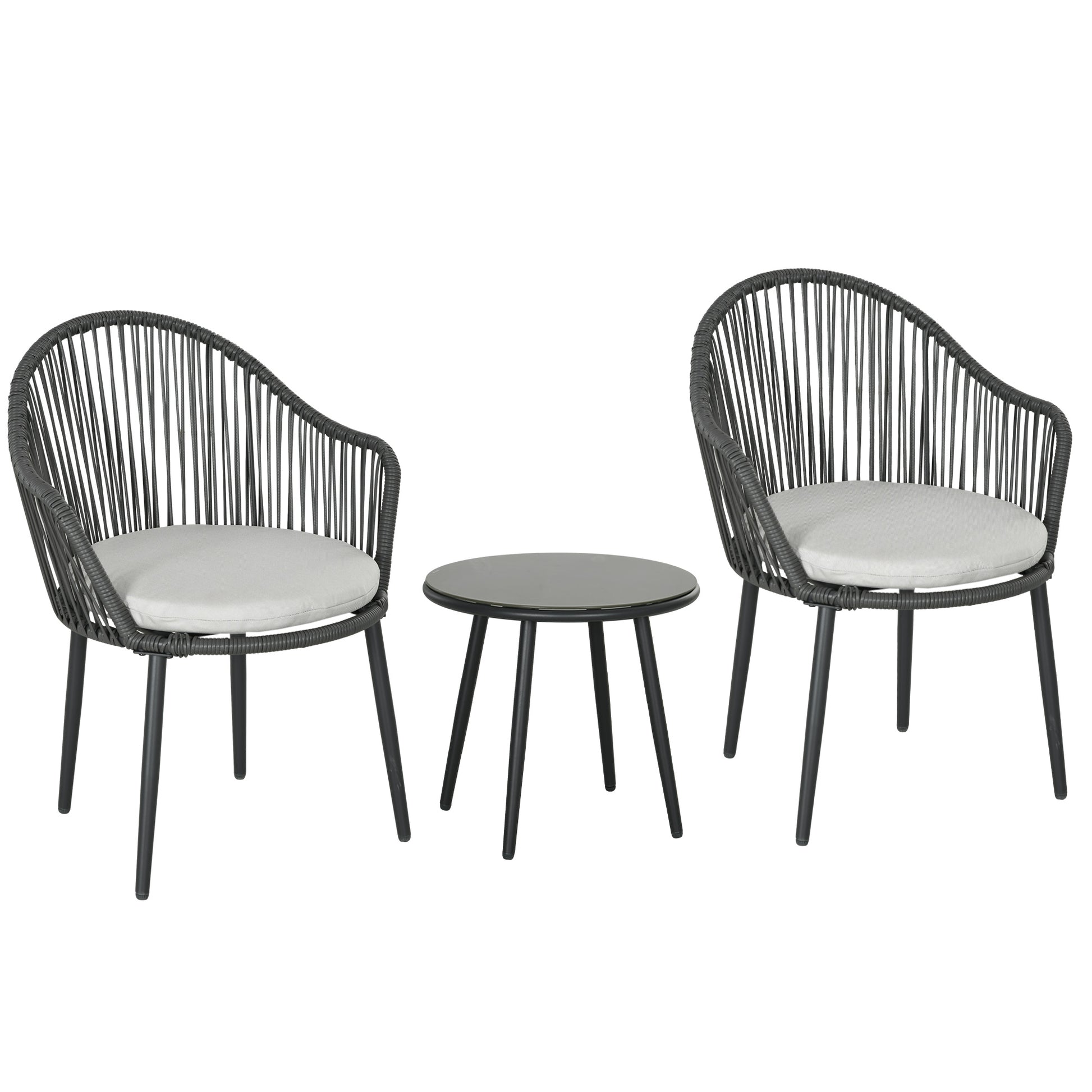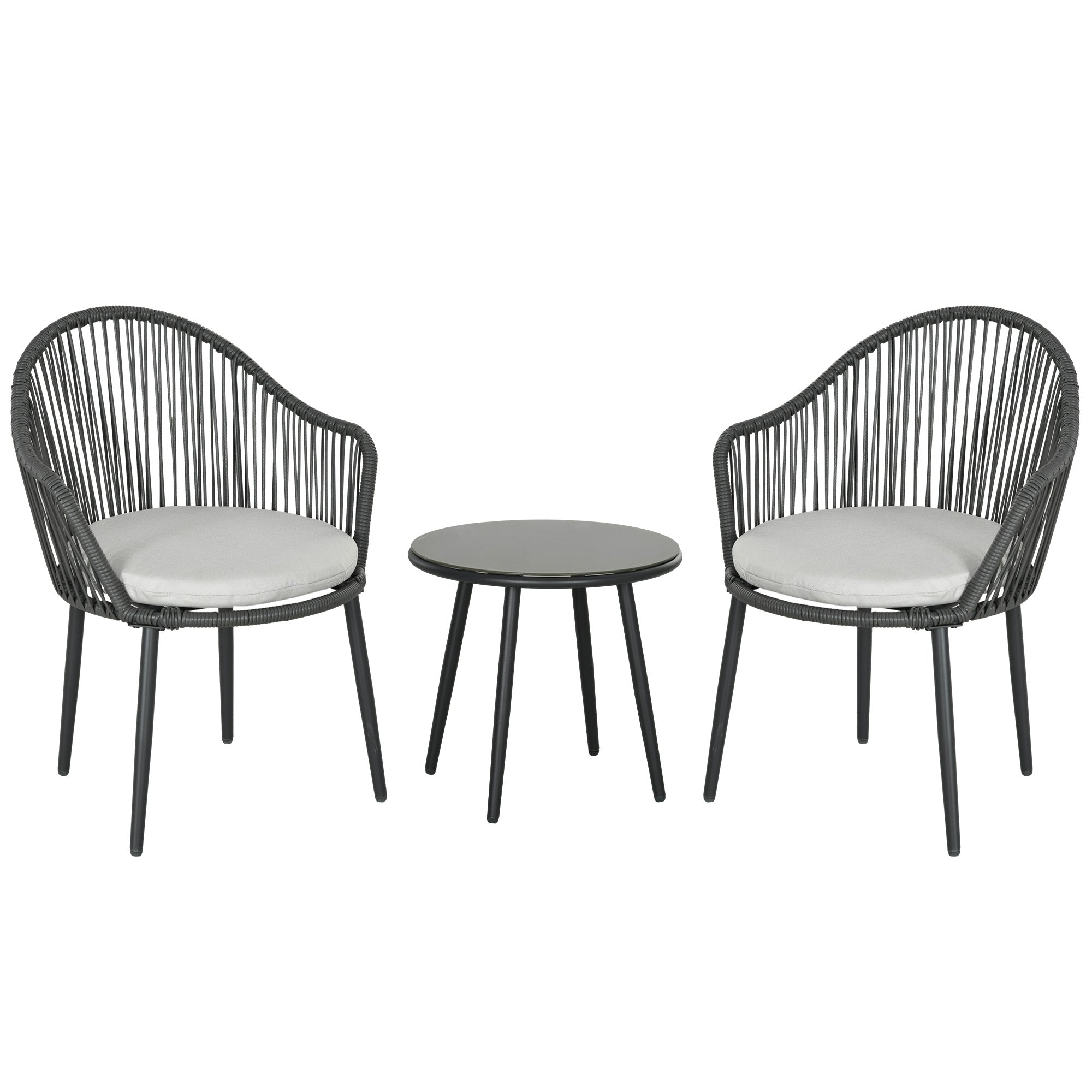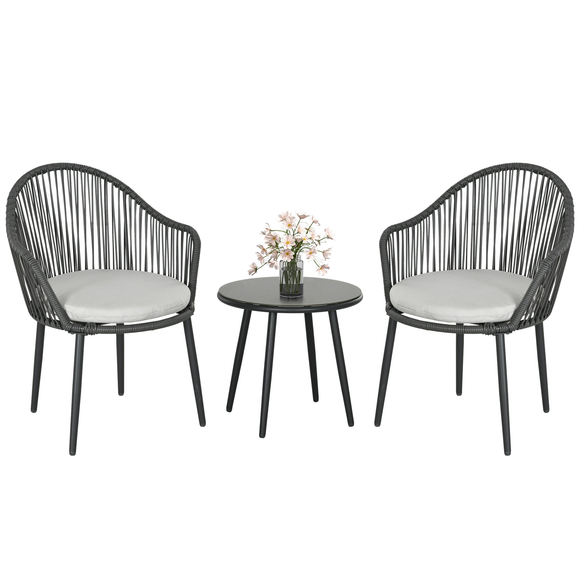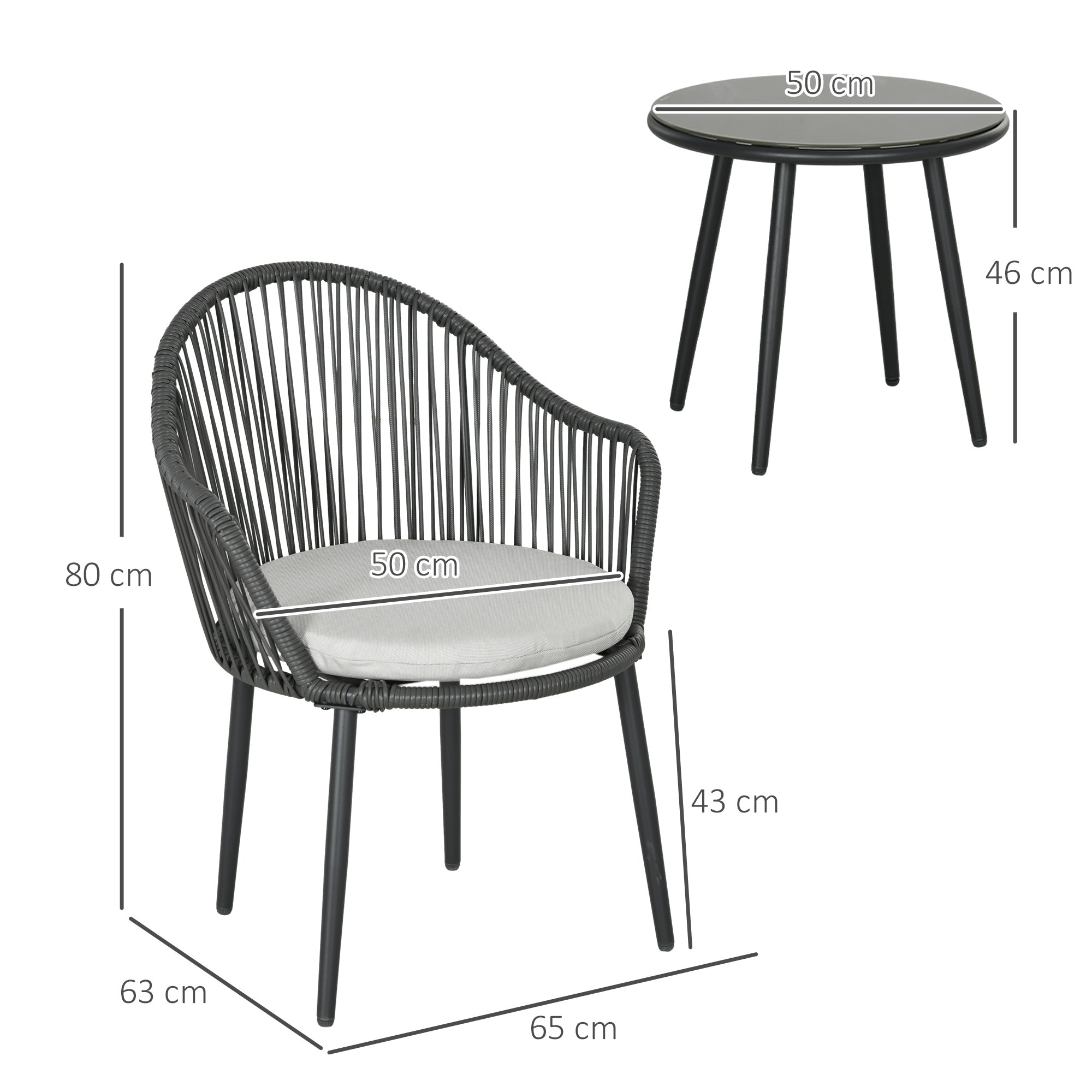 Outsunny 3-dielna sedačka z ratanového záhradného nábytku, set s 2 záhradnými stoličkami, bočným stolíkom s temperovaným skleným vrchom a vankúšmi na balkón alebo terasu, oceľ, tmavošedá