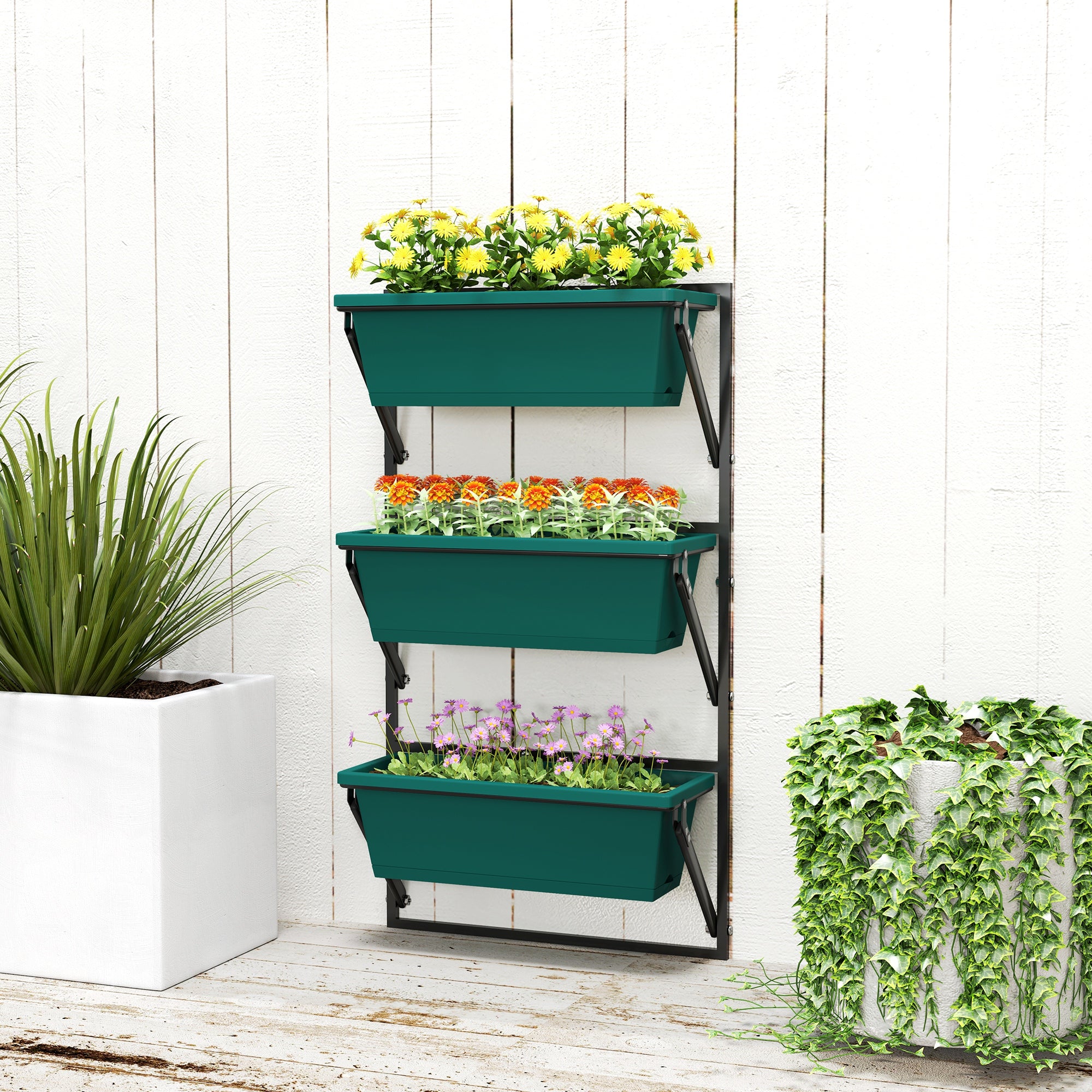 Outsunny 3-tierový vertikálny vonkajší kvetináč s 3 plastovými vonkajšími kvetináčmi s drenážnymi otvormi, závesný stojan na kvety a bylinky, 56x42x100 cm, Zelený