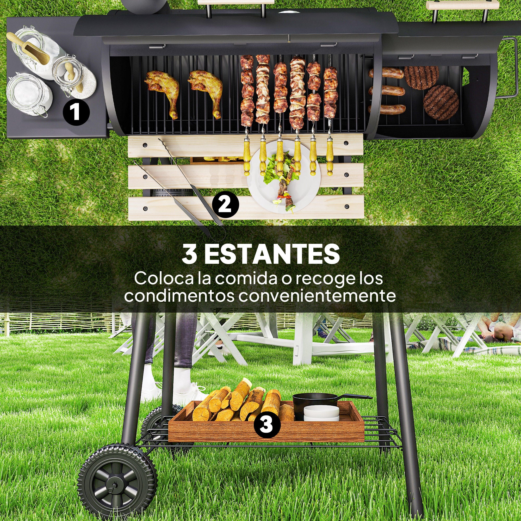 Outsunny 3-v-1 Uhlový Gril a Smoker s Teplomerom a Kolieskami 124x53x104 cm s Drevenými Policami na Piknik a Kempovanie vonku