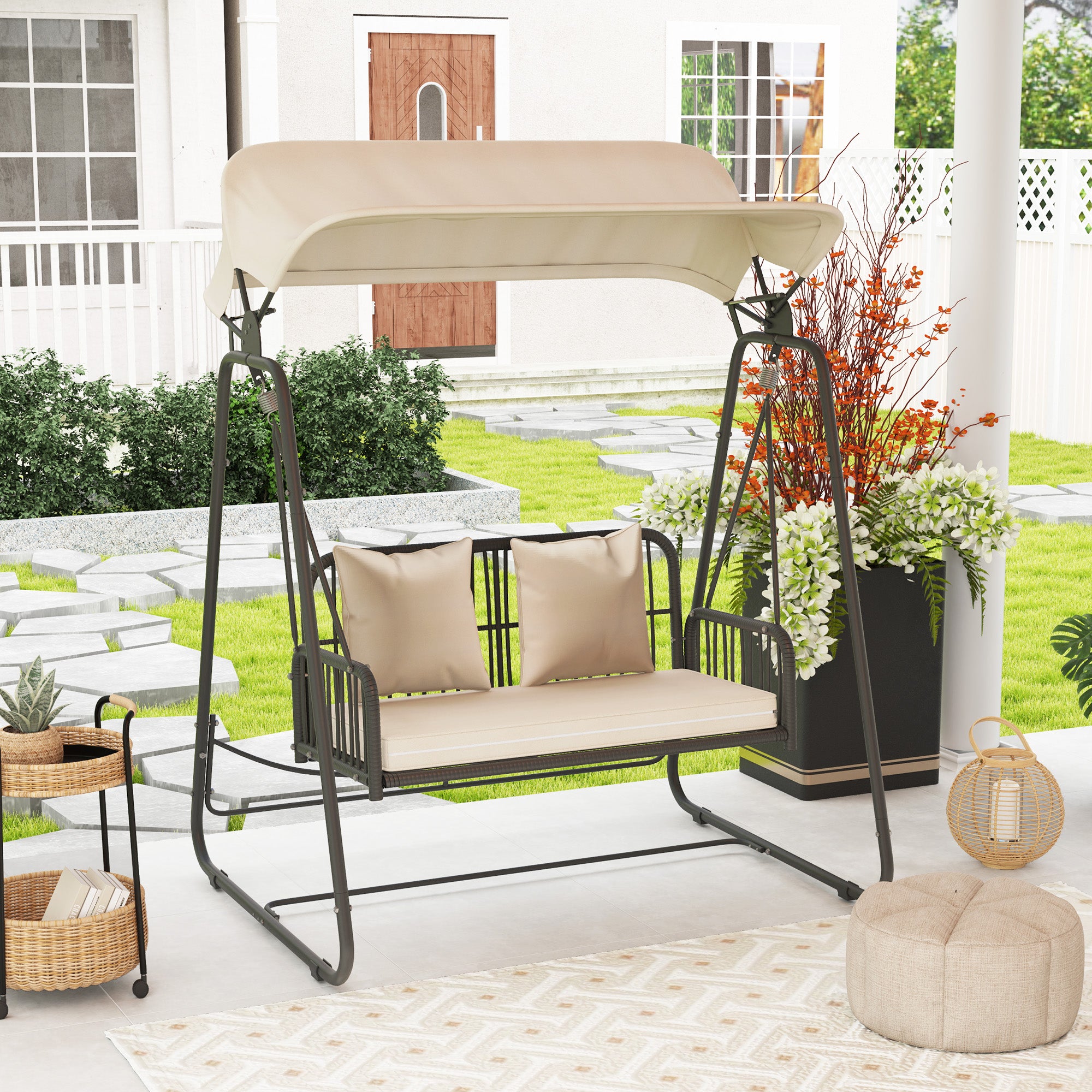 Outsunny Ratanový Hollywood Hojdačka pre 2 Osoby so Zosúvateľnou Strieškou a Poduškami - Záhradná Hojdačka s Nosnosťou do 240 kg - Hojdačka na Záhradu či Balkón 149 x 121 x 180 cm Khaki