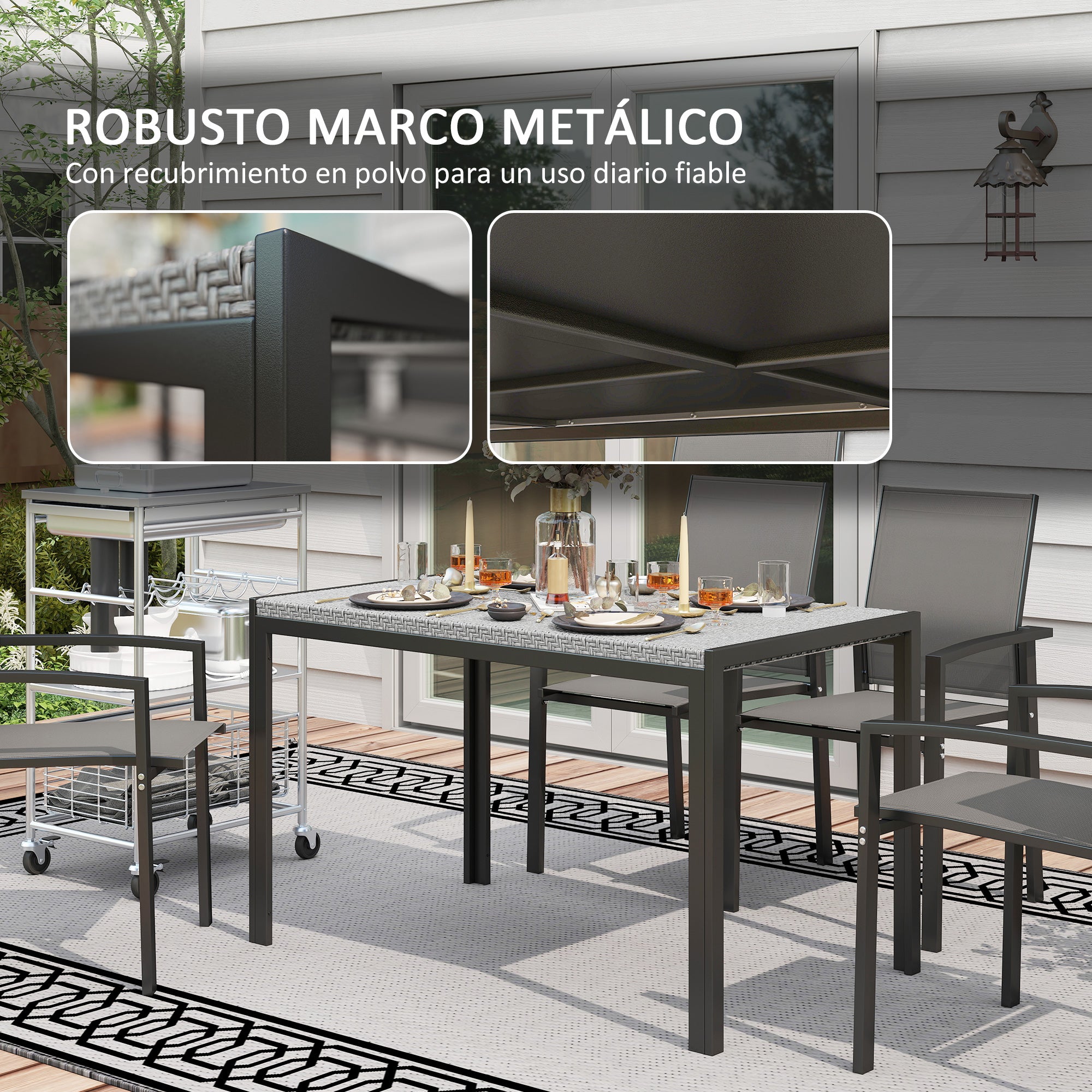 - - KOVOVÁ KONŠTRUKCIA: Ratanový jedálenský stôl má robustnú kovovú konštrukciu s práškovým nástrekom. Táto kombinácia zabezpečuje stabilitu, trvácnosť a odolnosť, ideálnu na dlhodobé vonkajšie používanie