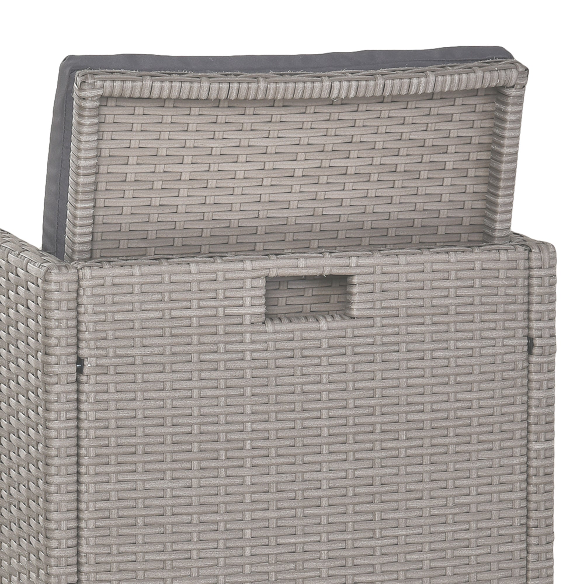 - - Farba: Šedá konštrukcia, čierne sedáky - Materiál: PE ratan, oceľové rúry, polyesterová látka - Stôl: 109 × 109 × 72 cm - Stolička: 56 × 52 × 87 cm - Podnožka: 41 × 41 × 31 cm - Výška sedadla: 40 cm - Maximálne zaťaženie stola: 70 kg - Maximálne zaťaženie stoličky: 120 kg - Maximálne zaťaženie podnožky: 100 kg