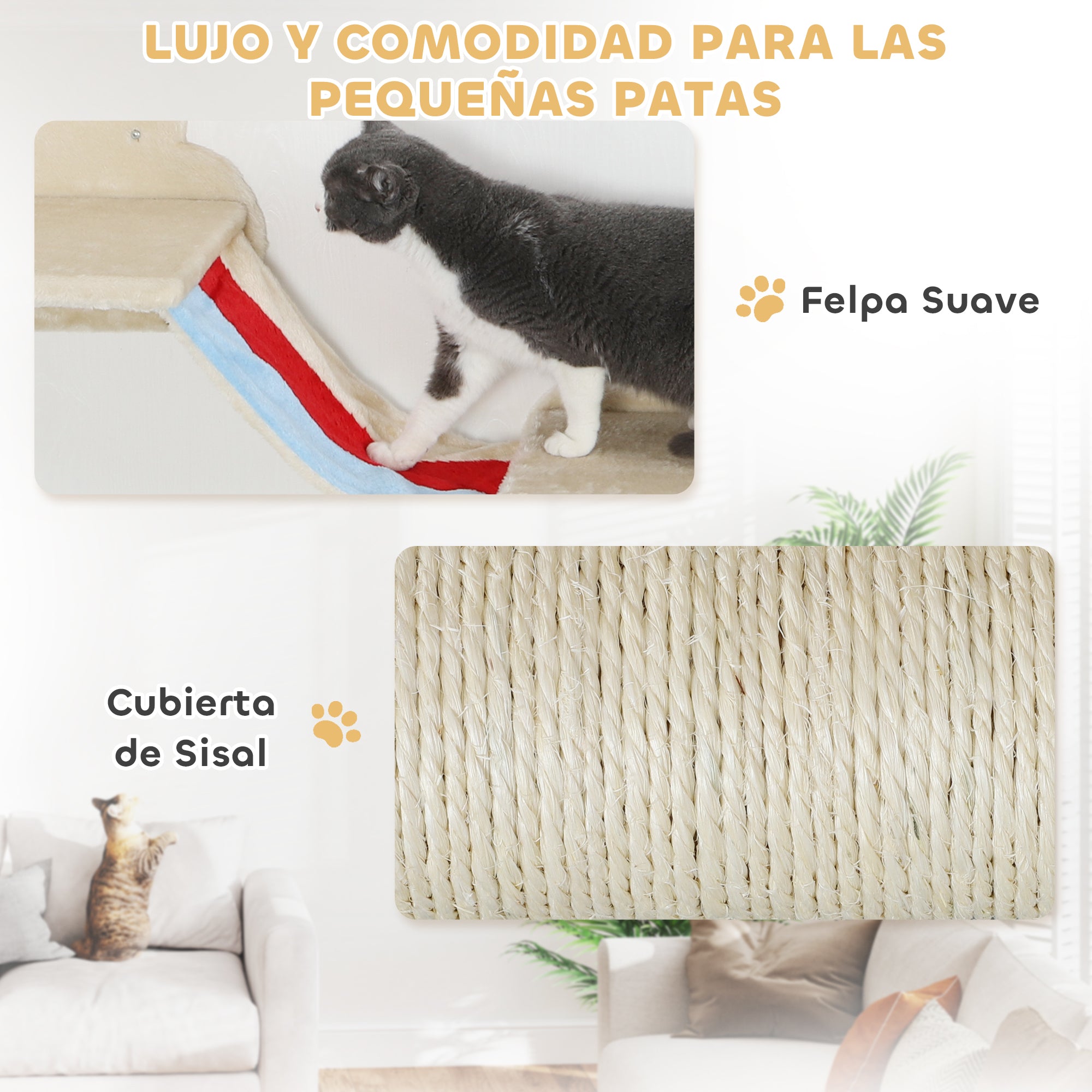 PawHut 6-dielna nástenná lezecká hra pre mačky s témou neba - mačacie police s hojdacími sieťami, plošinami, schodmi, škrabacou doskou a sisalovým stĺpikom so hviezdami Béžová
