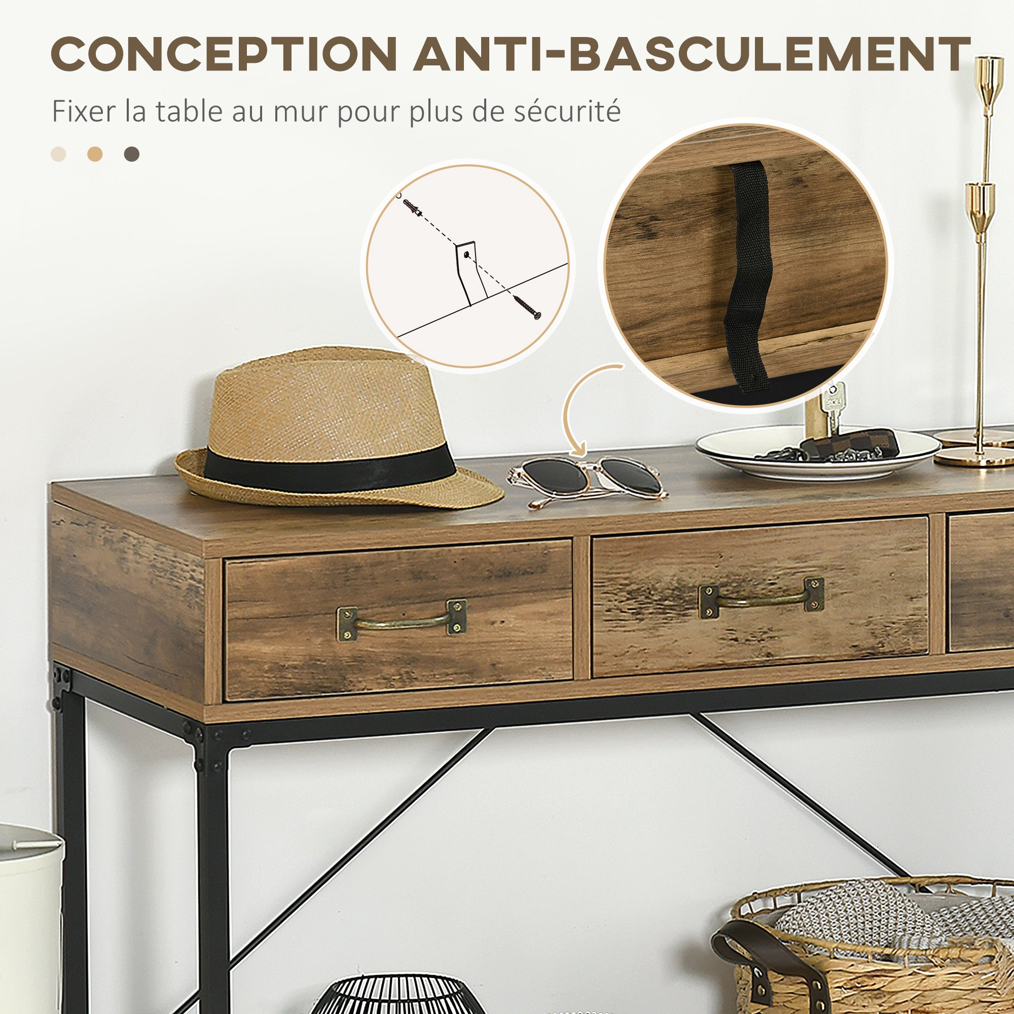 HOMCOM Konsole, Miza za predsobo, Končna miza, Okvir iz ogljikovega jekla, Enostavna montaža, s 3 predali in 1 pladenj iz lesa, Industrijski dizajn, 100 x 35 x 76,5 cm, Svetlo rjava