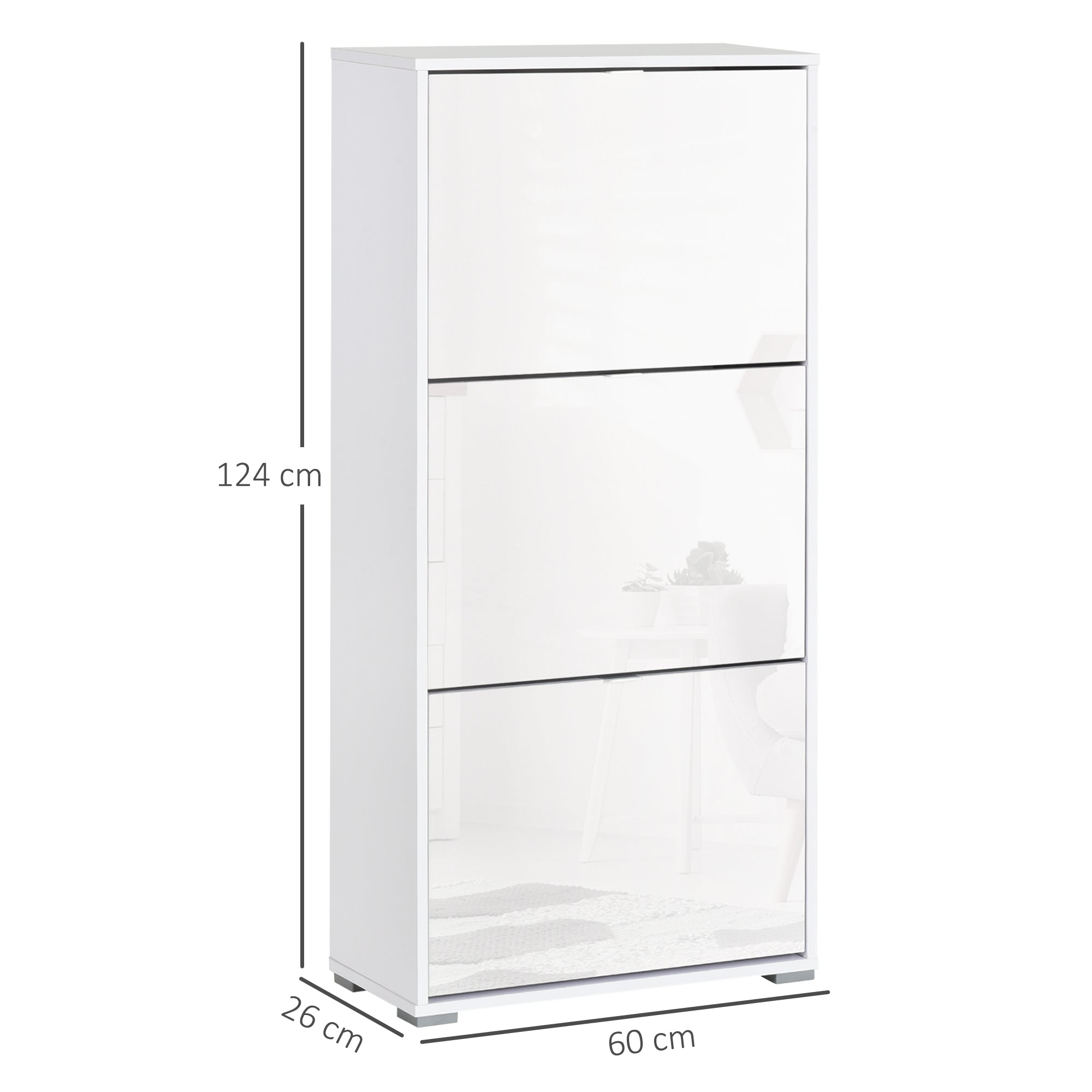 HOMCOM Kabinet za Shranjevanje Čevljev s 3 Spuščajnimi Vrati in 3 Predelki, Les, 60L x 26W x 124H cm, Visoki Sijaj Beli