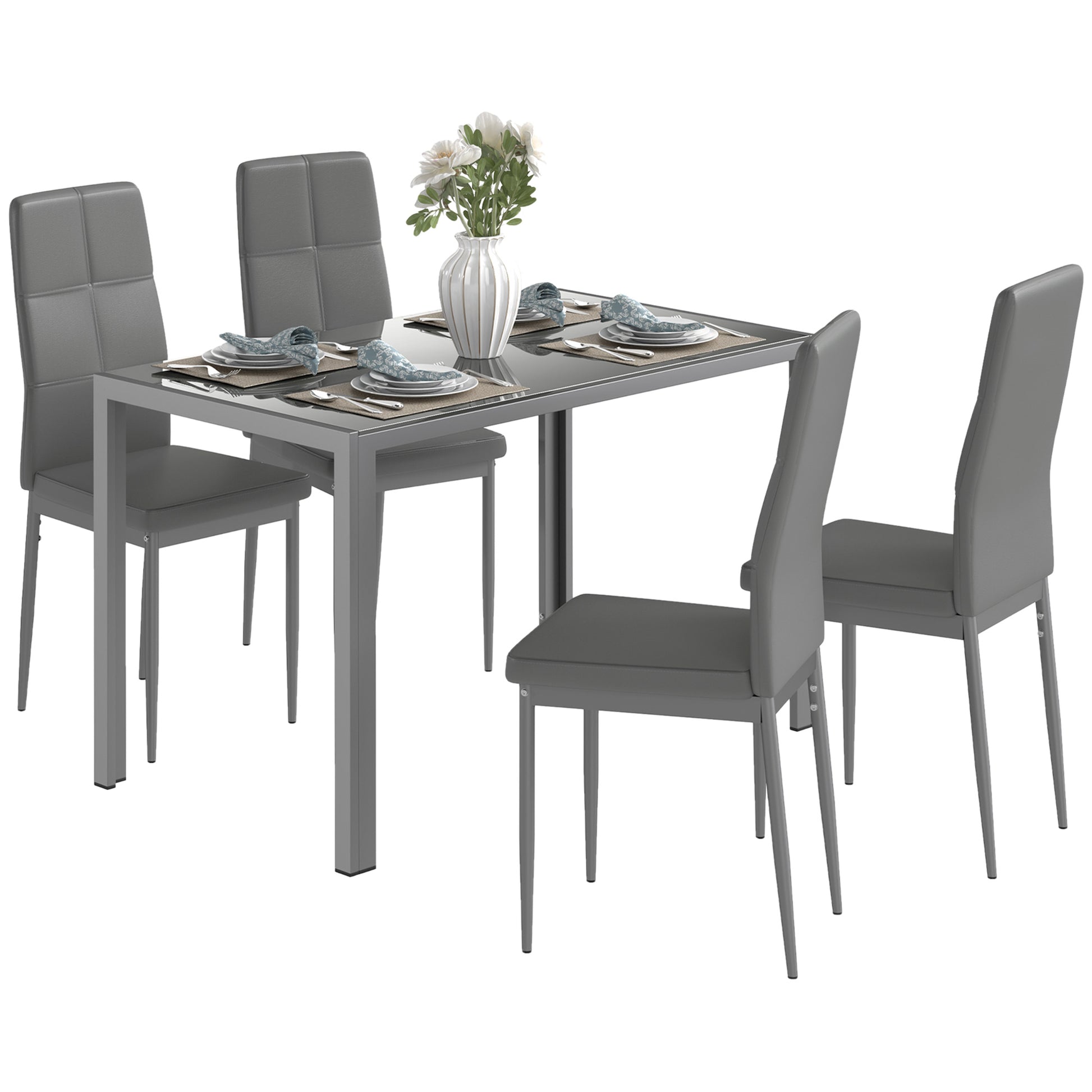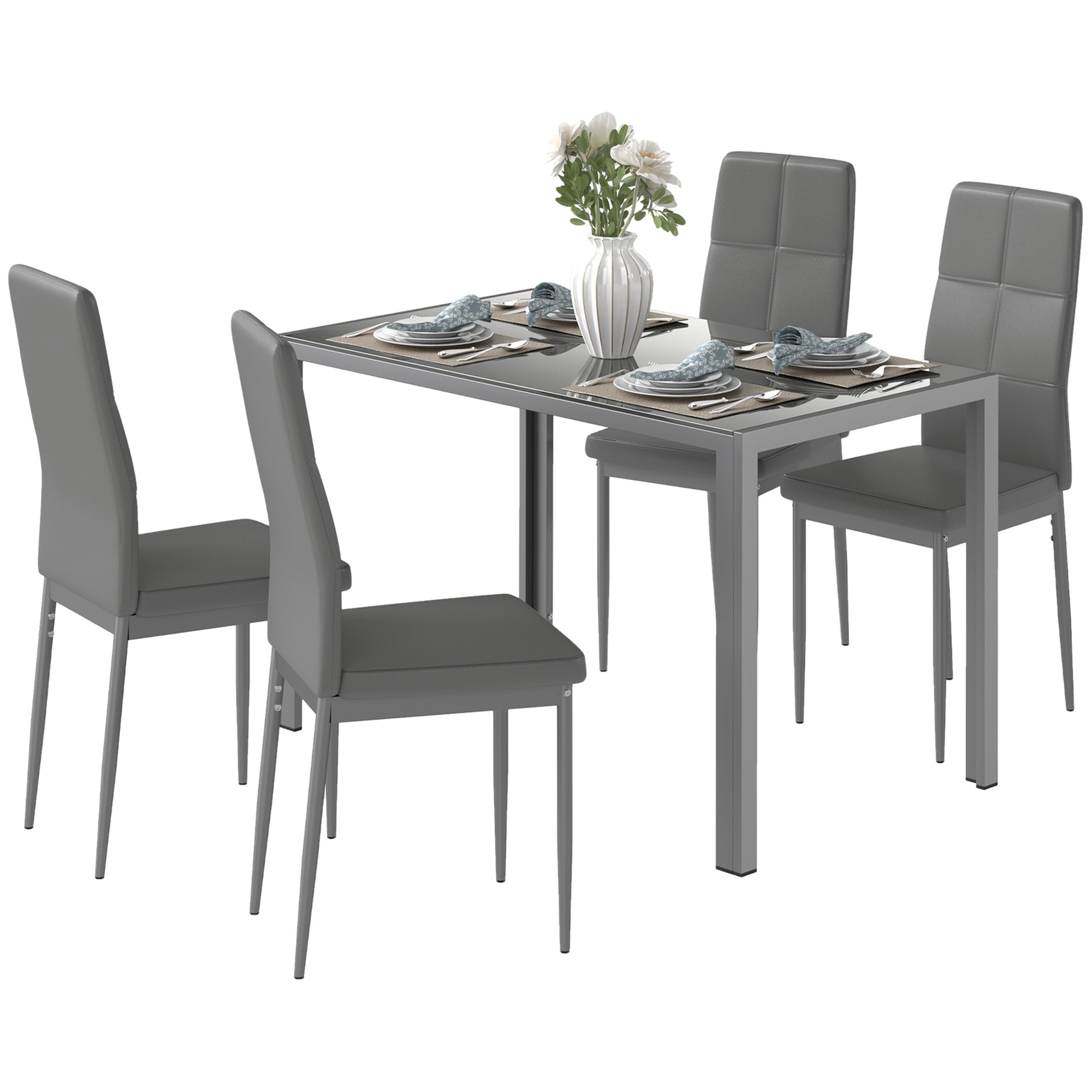 HOMCOM 5-delni jedilni set z 1 jedilno mizo in 4 modernimi stoli iz umetnega usnja, kovine in kaljenega stekla, siva