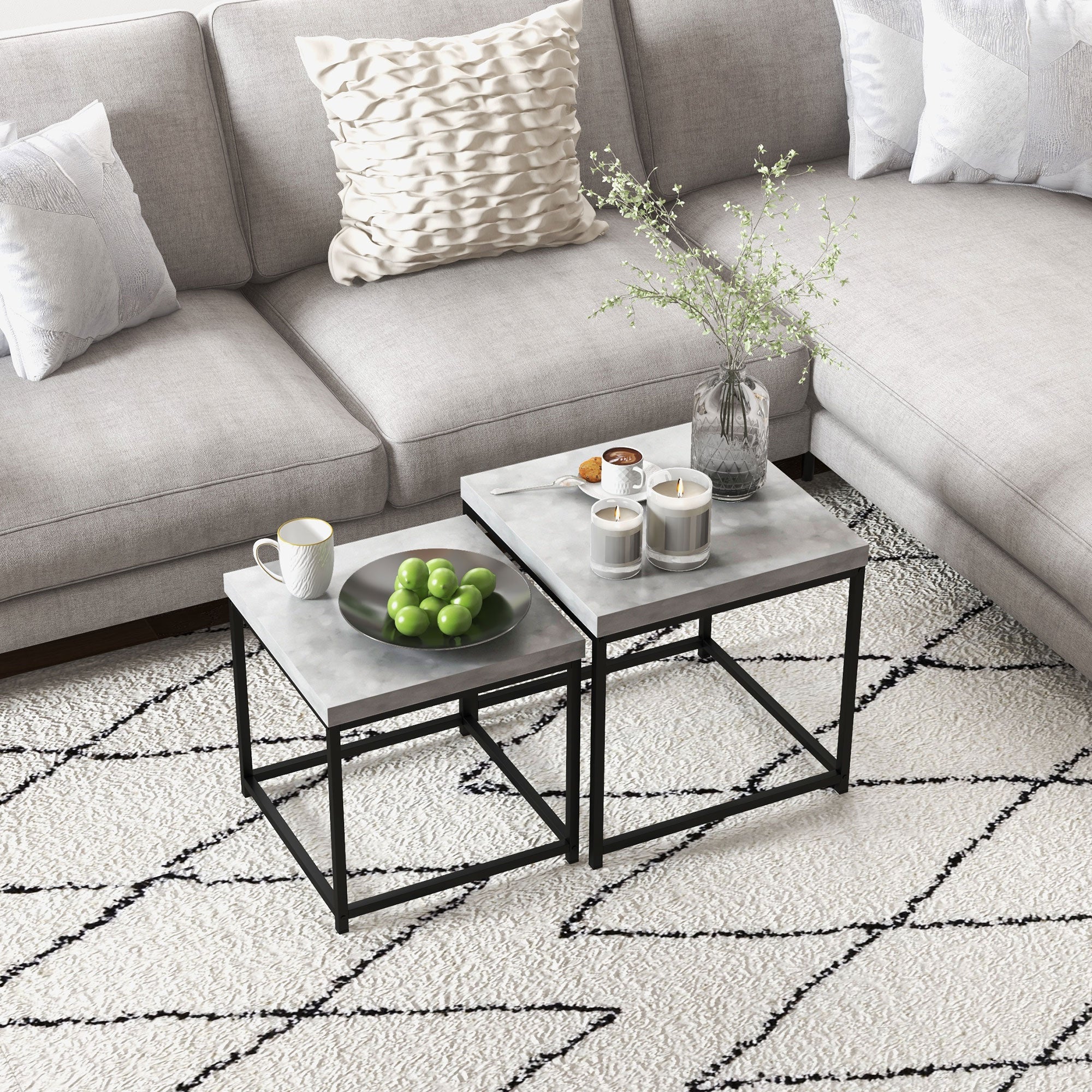 HOMCOM Komplet 2 nestabilnih kvadratnih mizic za kavo s jeklenim okvirjem in sivimi lesnimi ploskvami