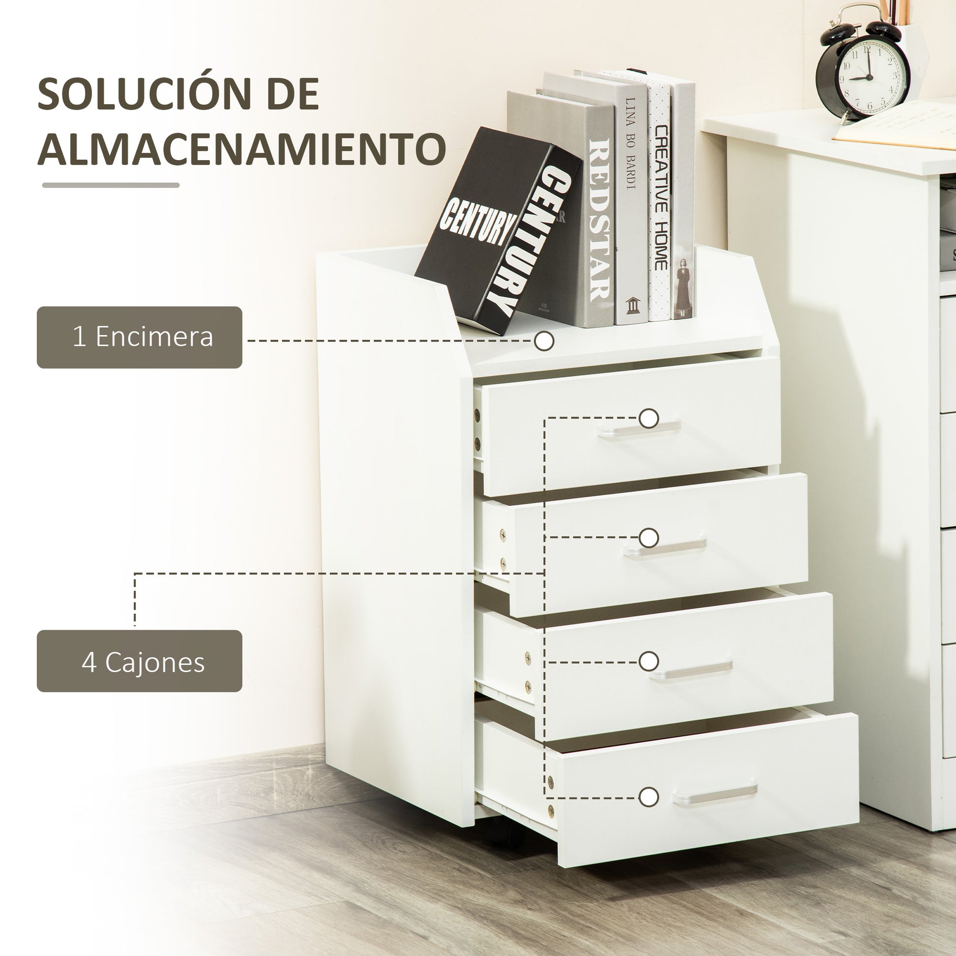 - - PROSTOR: Ta enota z zaklepanjem ima zgornjo površino z dvignjenimi robovi, ki ohranja vse, kar potrebujete pri roki in preprečuje padanje predmetov ob premikanju ter 4 predale za diskretno organizacijo office stvari, kot so dokumenti, pisala itd.
