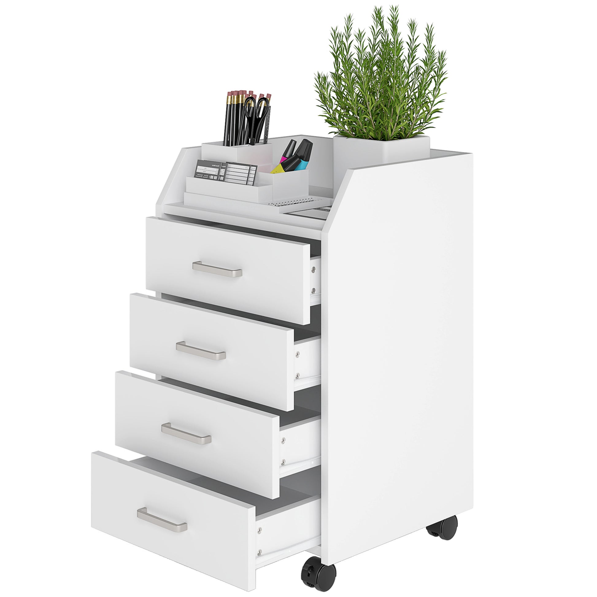 Vinsetto Pisarniška enota z predali - 4 predali, zgornja shranjevalna površina, 4 kolesa in 2 zavori za študij ali pisarno, 40x36x65 cm, bela