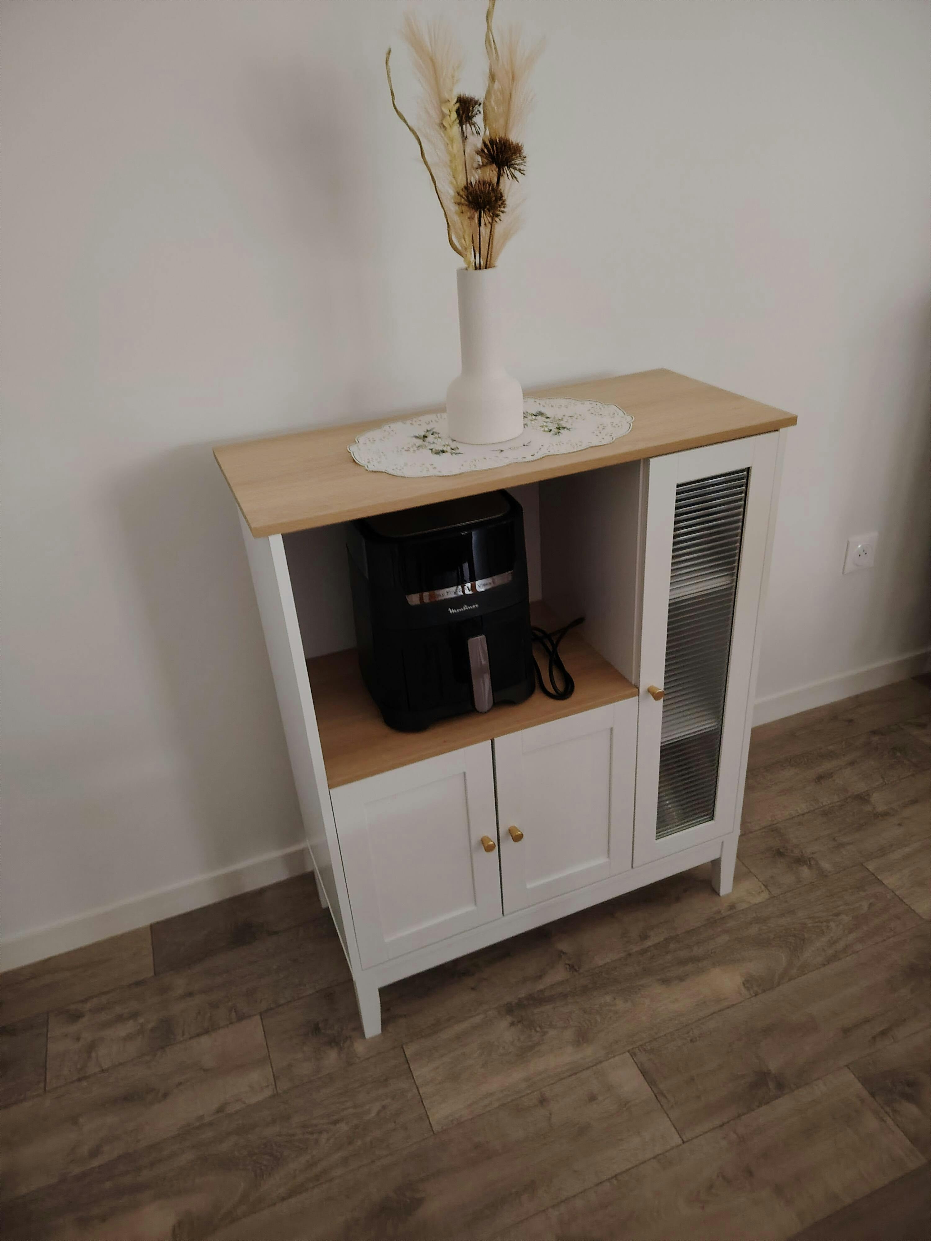 - - RYMLIG FÖRVARING: Detta köksskåp inkluderar flera förvaringsutrymmen. Det finns en stor nisch för att förvara din mikrovågsugn, brödrost eller andra småapparater, samt två stängda skåp för att förvara dina redskap, diskar eller andra tillbehör. Dessutom kan hyllorna bakom den transparenta dörren justeras upp och ner för att maximera förvaringsutrymmet.