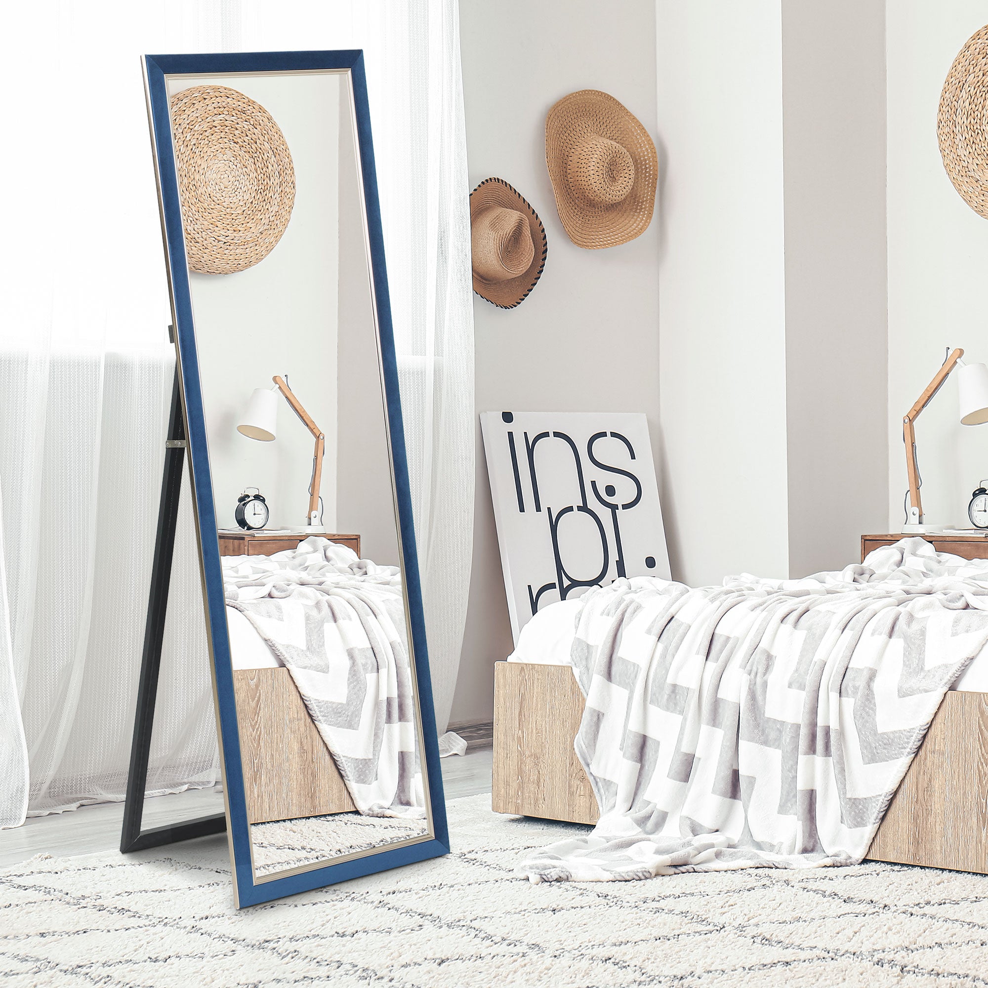 - - ELEGANT OCH MÅNGSIDIG DESIGN: Den polystyrenramen täckt med blå sammet ger en modern touch, vilket gör denna helkroppsspegel lätt att smälta in i alla inredningsstilar